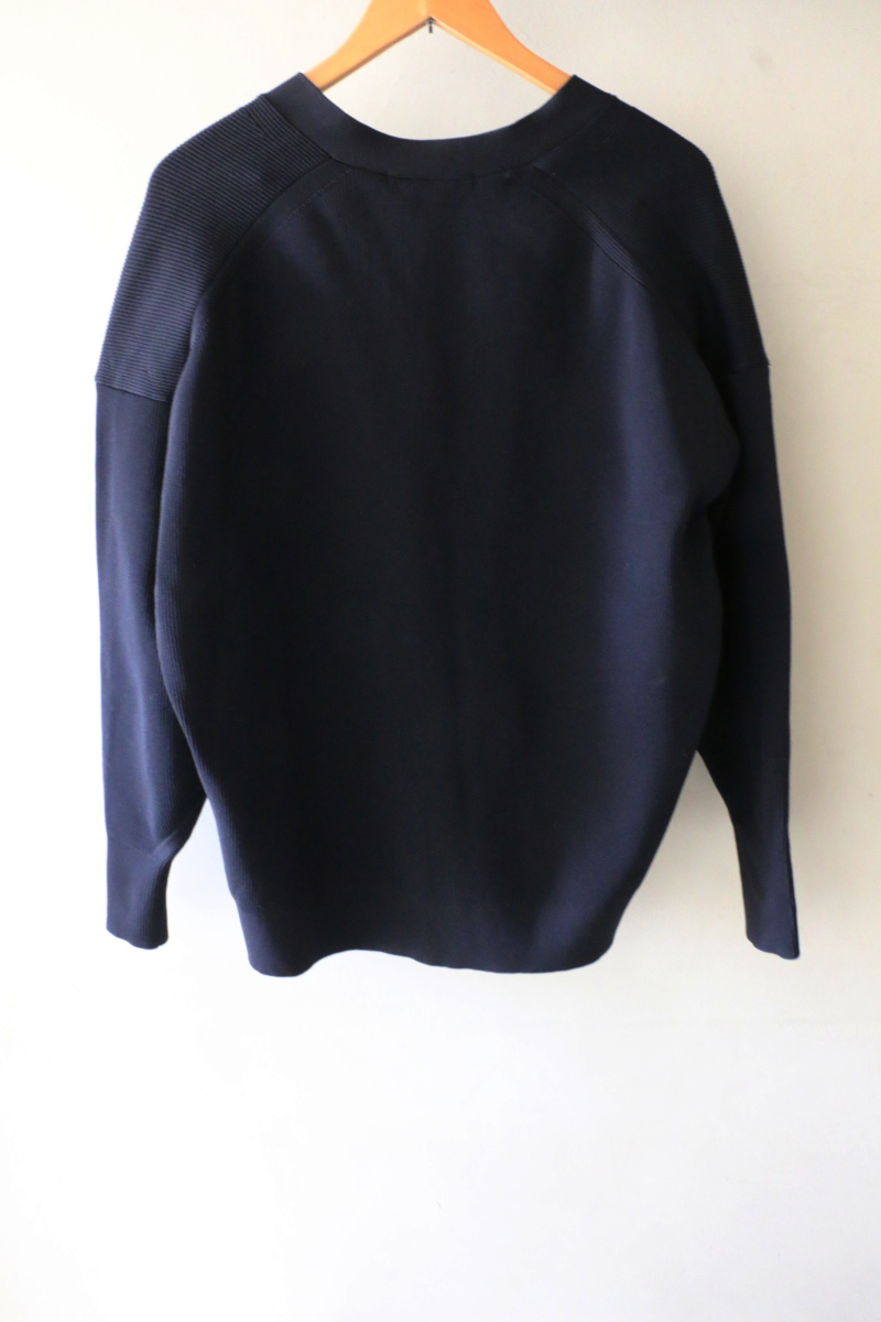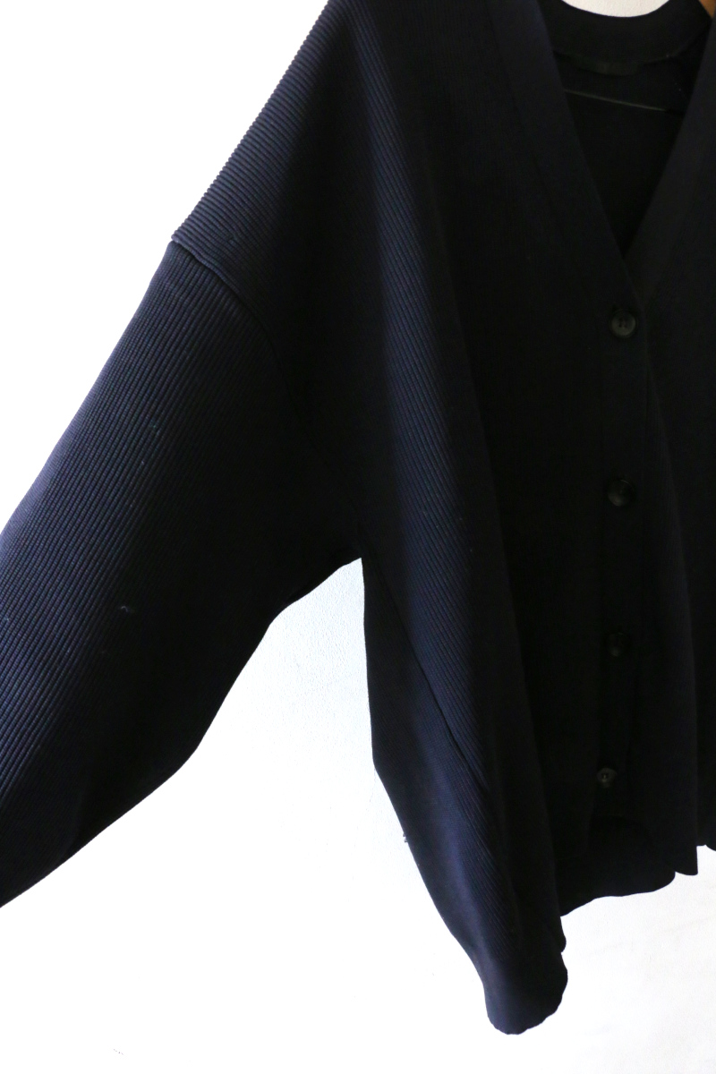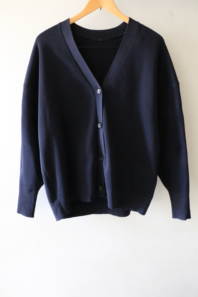 プルオーバー感覚で着られるクローゼットの定番になってくれるカーディガン。着るだけで絵になるシルエットで後ろから見ても、袖を捲くった表情も素敵です。膨らみのあるハイゲージなニット素材ですが、程よく身体に沿うようにデザイン。シンプルながらも拘ったニットです。