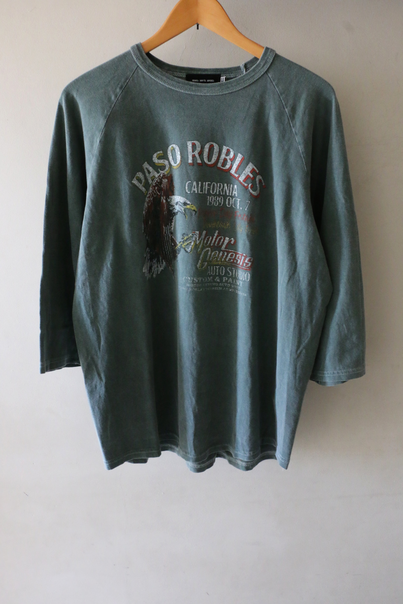 ラグラン7分袖のややゆったりしたロックテイストモチーフプリントのTシャツ。