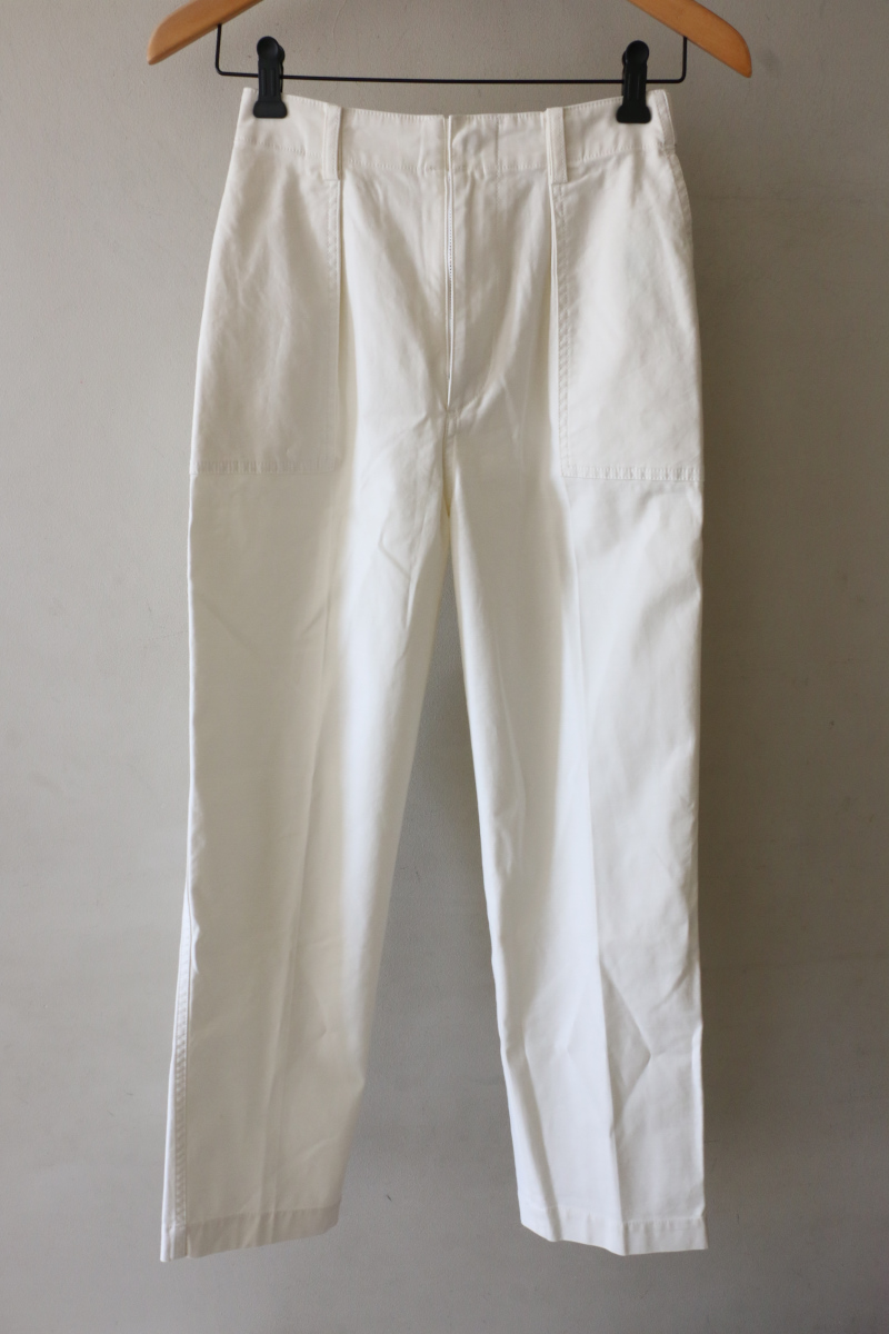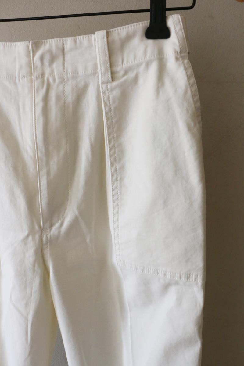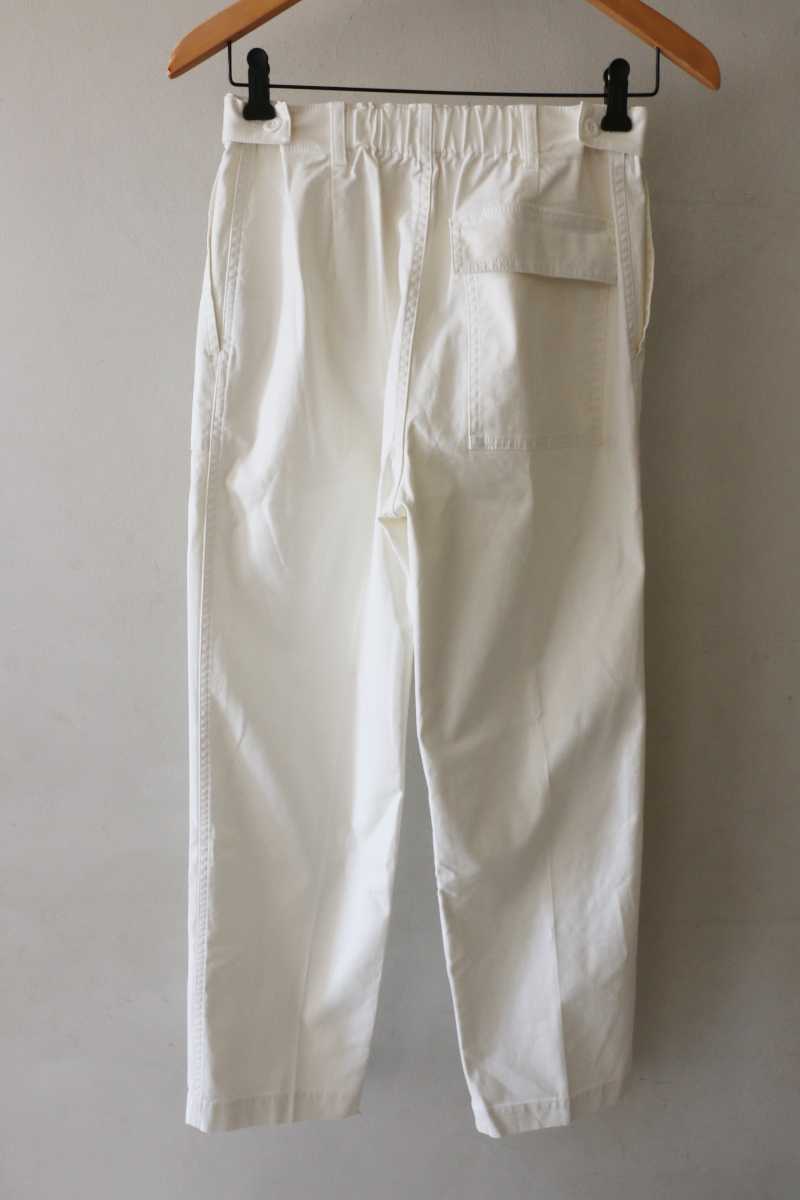 独特な表情がポイントのバックサテンで作ったワンタックイージーパンツ。カーゴパンツの特徴でもあるサイドポケットをなくしたシンプルなデザイン。程よくワイドなシルエットにセンタープレスが入っており、脚のラインを綺麗にみせてくれます。ストレッチ素材でイージーウエスト、アジャストボタンで穿きやすさにこだわった1点。裾をロールアップして穿くのもお勧めです。季節を問わず年中着まわせるオールシーズンアイテムです。