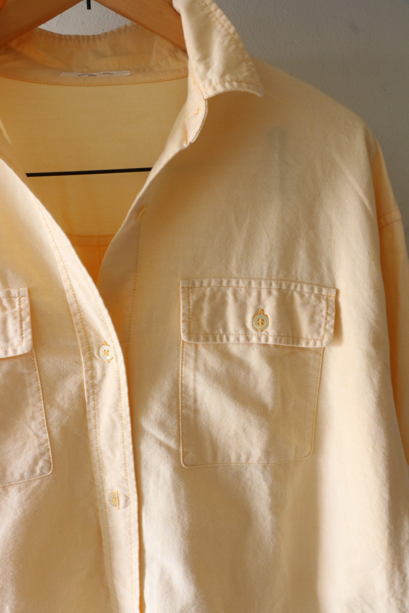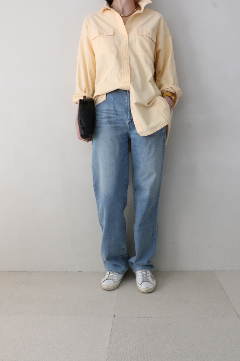 春の訪れを感じさせる爽やかなイエローのワイドシャツに、おとなしめの加工感のストレートデニムを合わせたコーディネート。顔まわりを明るく見せる華やかなカラーリングを主役に、リラックスしたシルエットでまとめることで、大人の日常に馴染む自然体なスタイルを作ります。