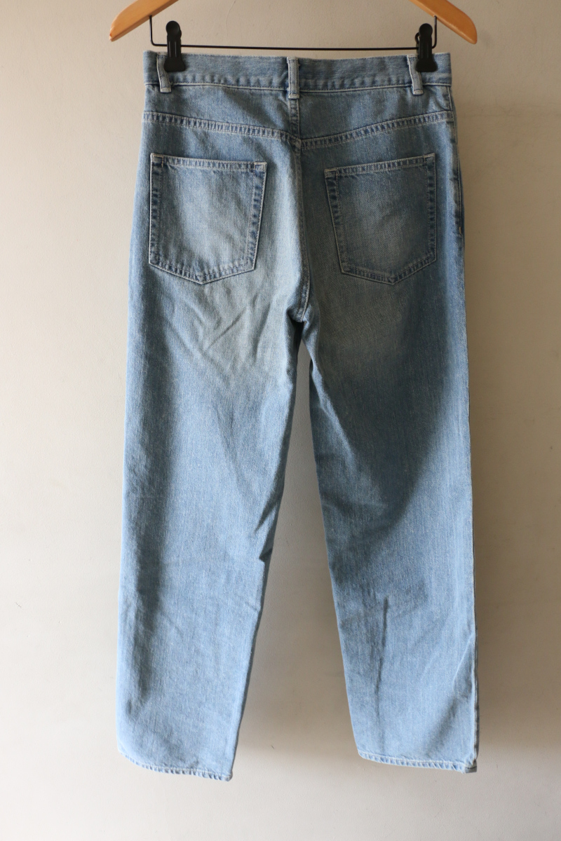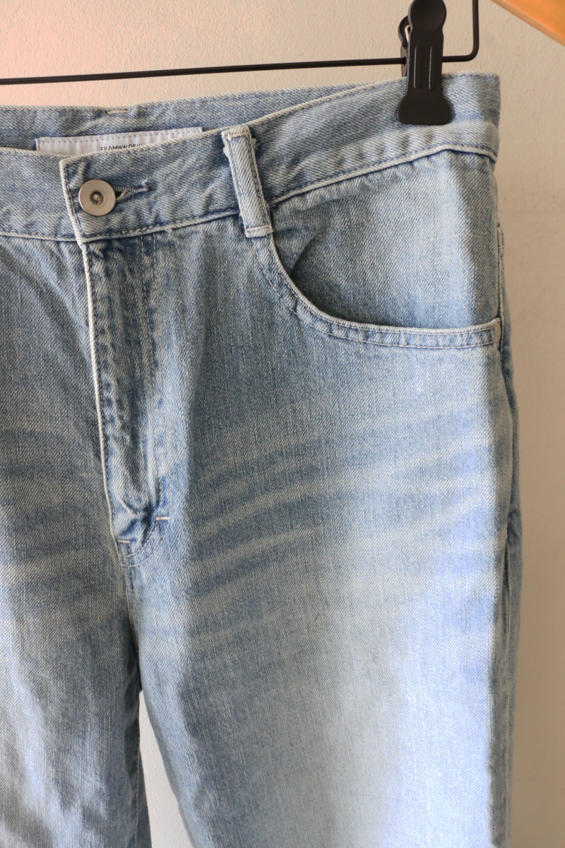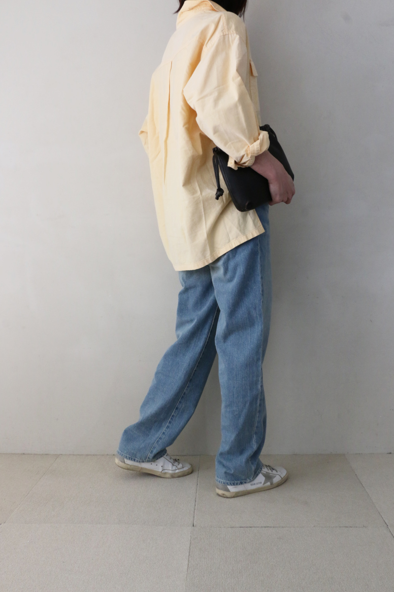 ボトムスには、FRAMeWORKのストレートデニムを合わせました。太ももから裾にかけて程よくゆとりを持たせたシルエットと、股下長めの設定が、脚のラインを美しく見せてくれます。ややドライな質感の生地は肌離れが良く、カジュアルな中にも落ち着きのある加工感が、明るいトーンのシャツを程よく引き締め、バランスの良い着こなしを叶えます。
