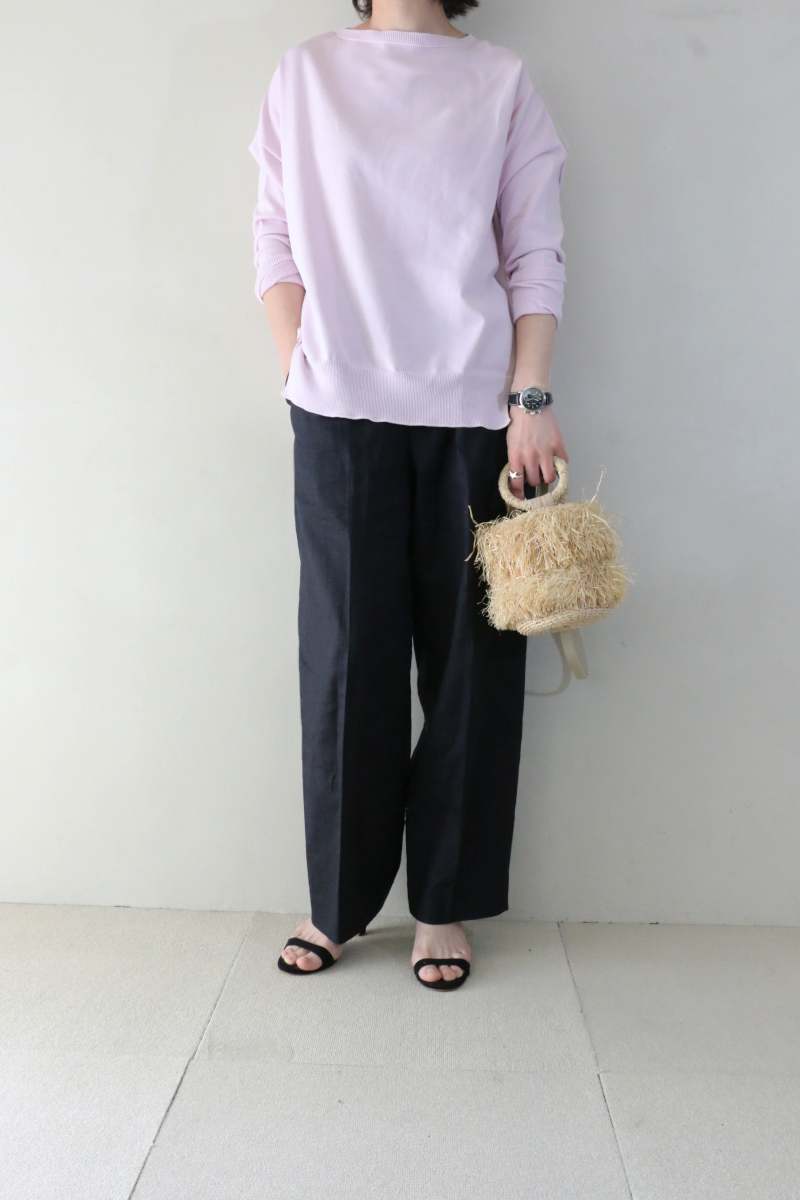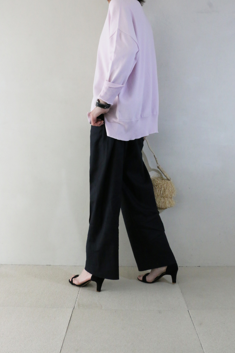 トップスは、IENAで高い人気を誇るコットンストレッチNEOワイド長袖プルオーバー。コットンにポリエステルをブレンドすることで、さらりとした肌触りと、身体のラインを拾いすぎない程よいハリ感を持たせています。ワイドな身幅とフロントのスリットが作る立体的なシルエットは、自然な抜け感を添えてくれます。