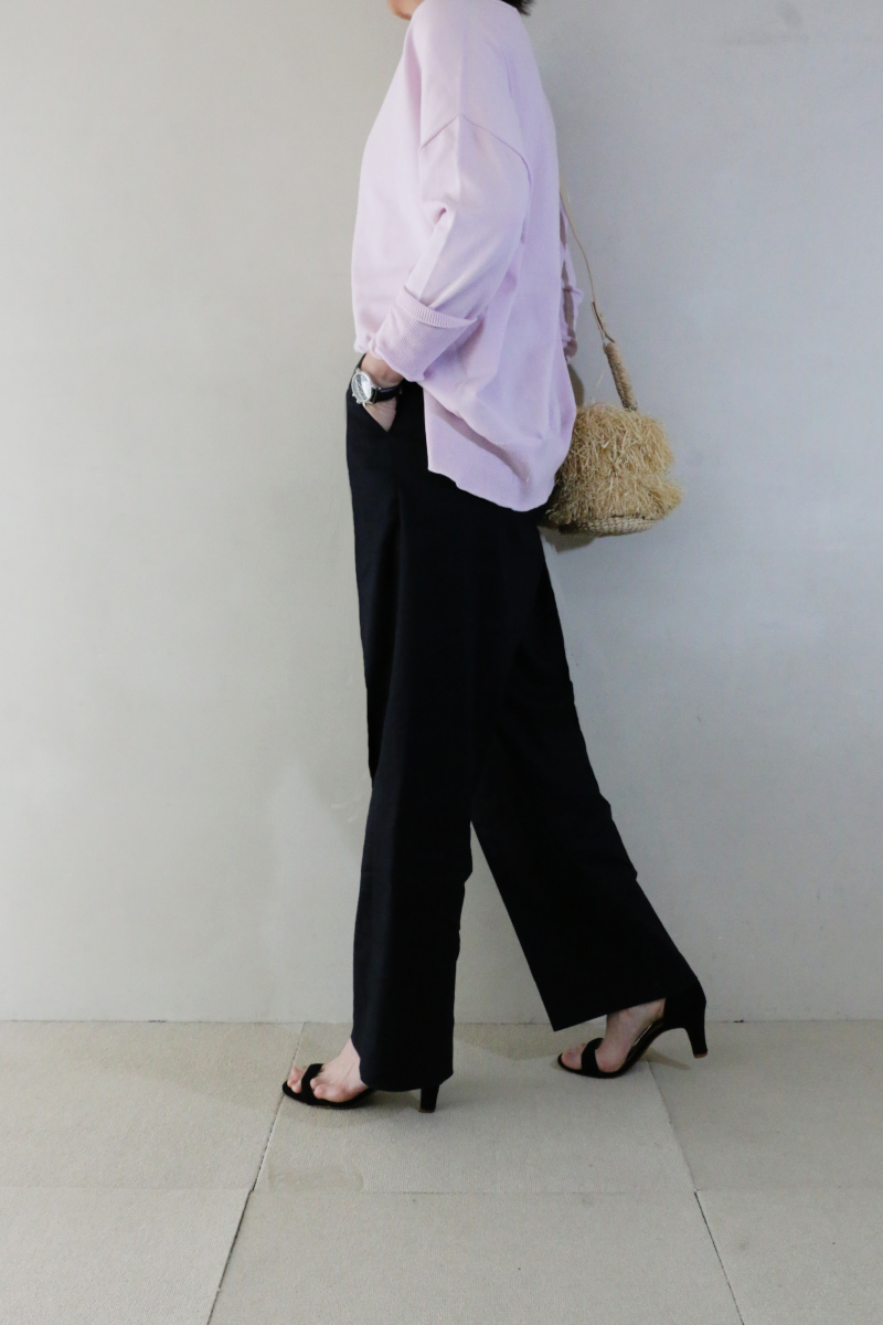 心浮き立つような淡いピンクのプルオーバーに凛としたネイビーのパンツを合わせた、春の陽射しに映えるコーディネートです。甘さと知性が同居する配色でまとめることで、大人の女性のシンプルで柔らかな空気感を作りました。