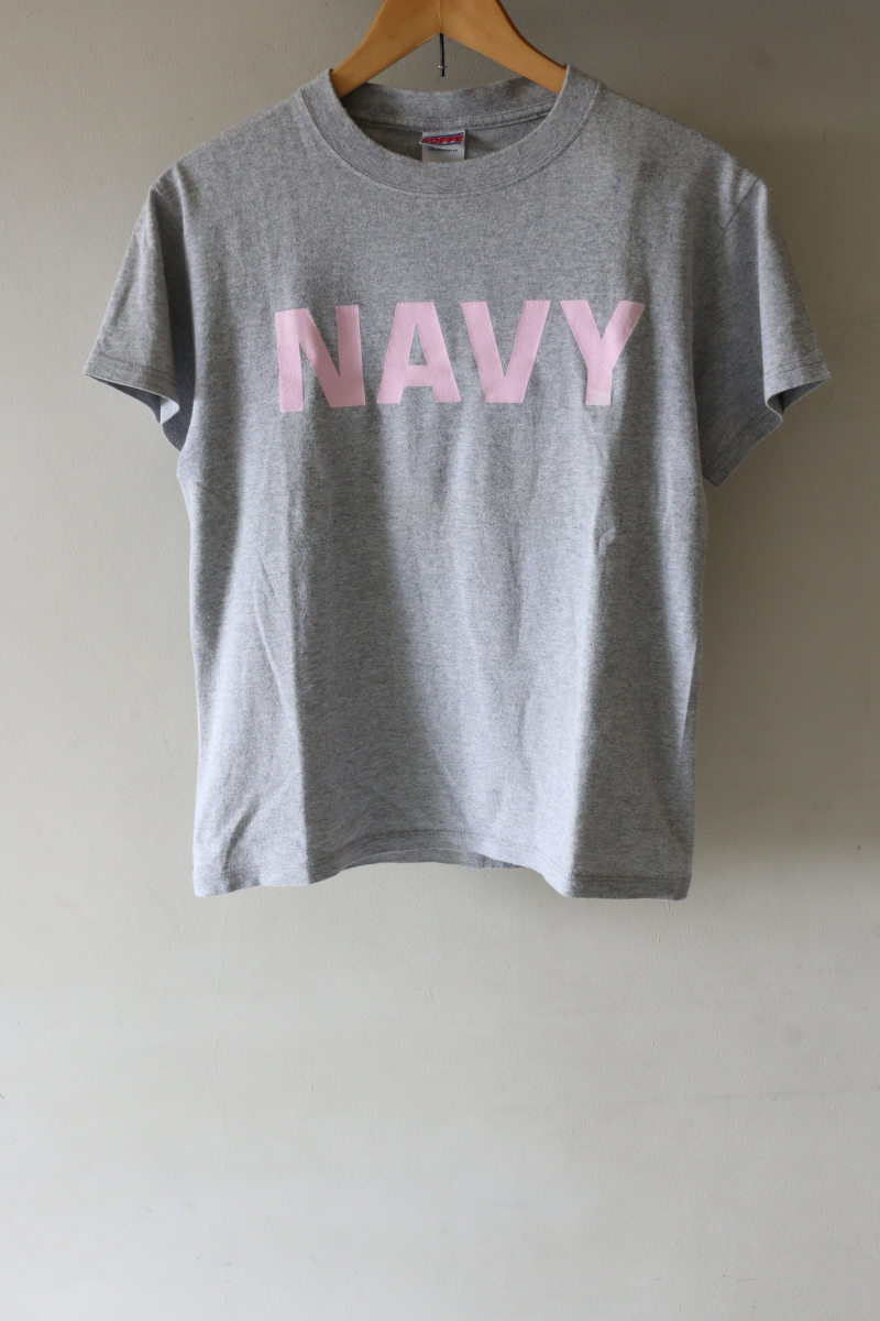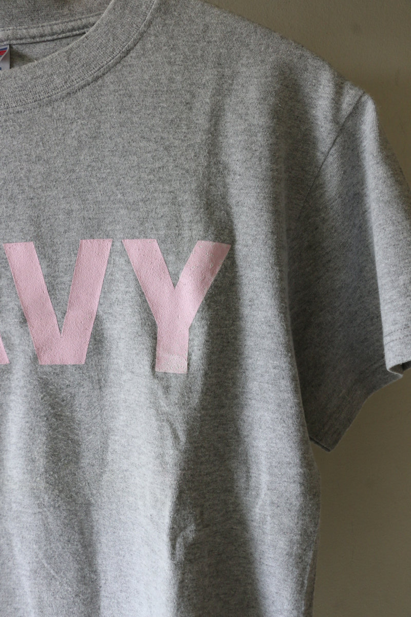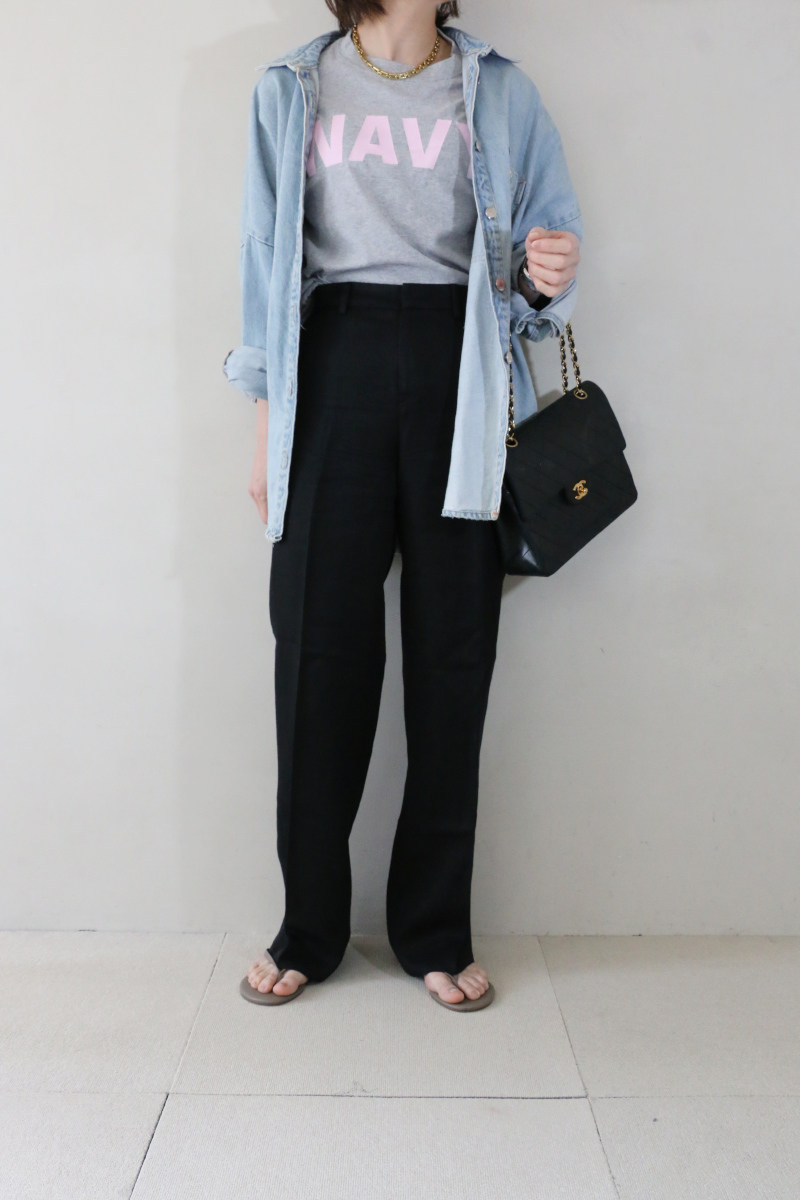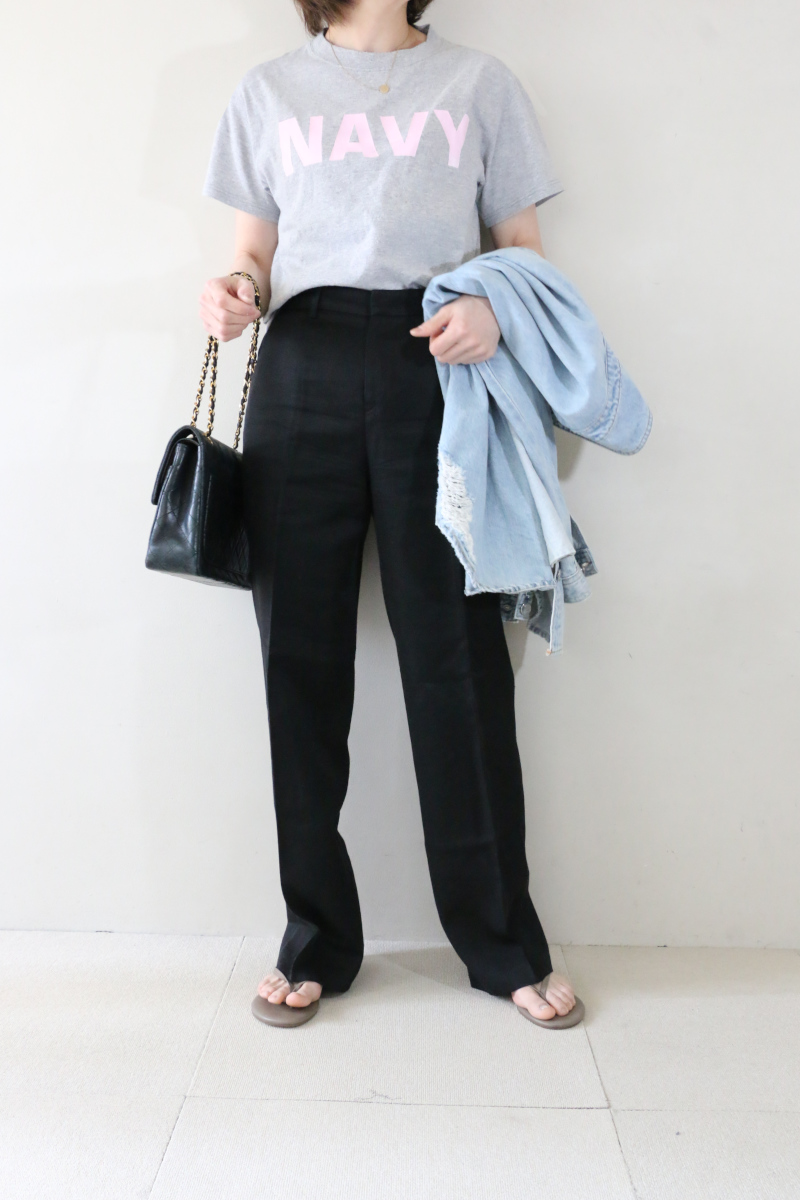 インナーに合わせたのは、米軍への供給実績も持つSOFFE(ソフィー)のロゴTシャツ。アメリカ製にこだわった自社工場で生産されており、タフな使用にも応えるトレーニングウェアとしての背景を持っています。グレーのボディに映える「NAVY」のロゴが、デニムジャケットの襟元から程よいアクセントとして覗きます。