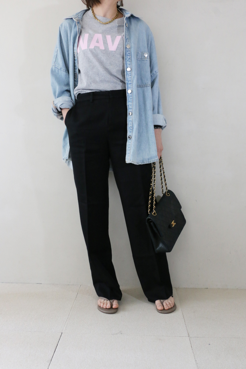 どちらもヴィンテージのような風合いを持つアイテム同士ですが、淡いトーンでまとめることで武骨すぎない軽やかさが生まれます。袖をラフに捲って手元に抜け感を作るバランスもお勧めできる着こなしです。