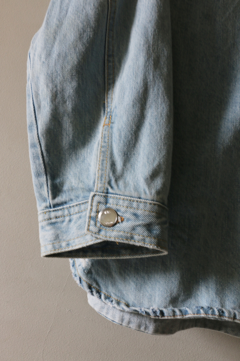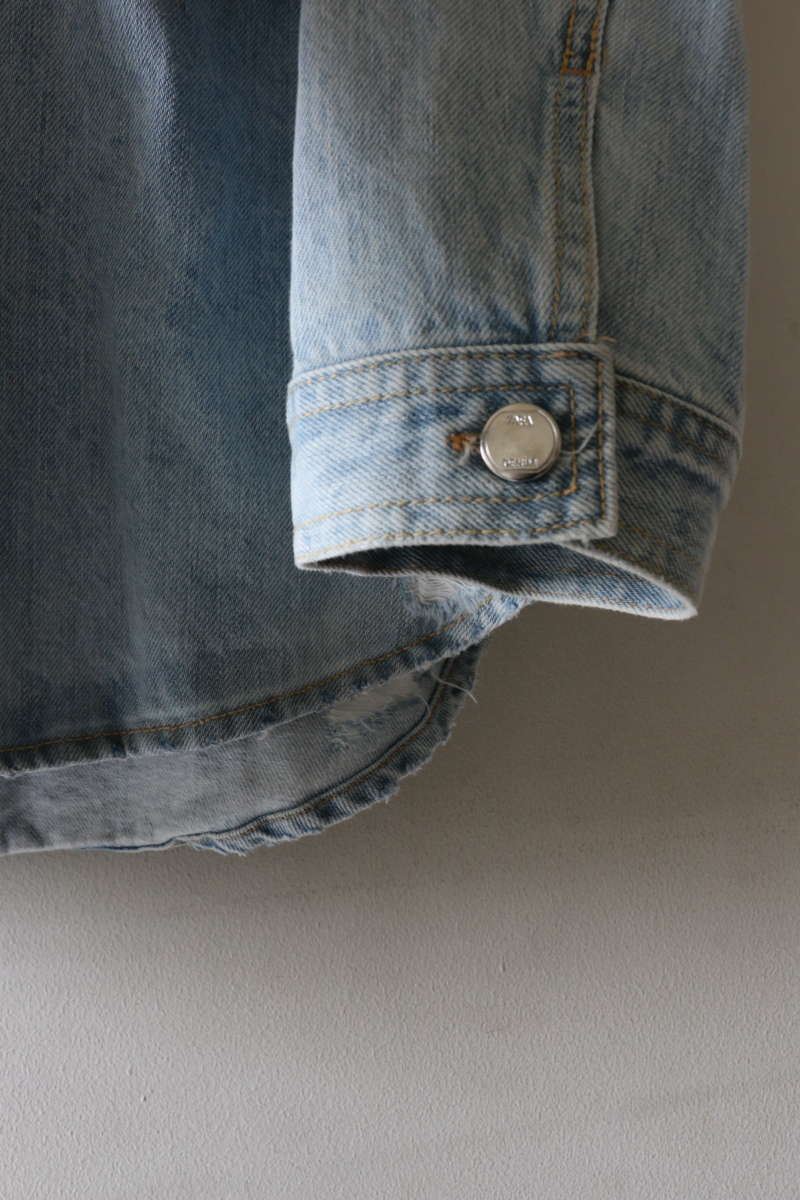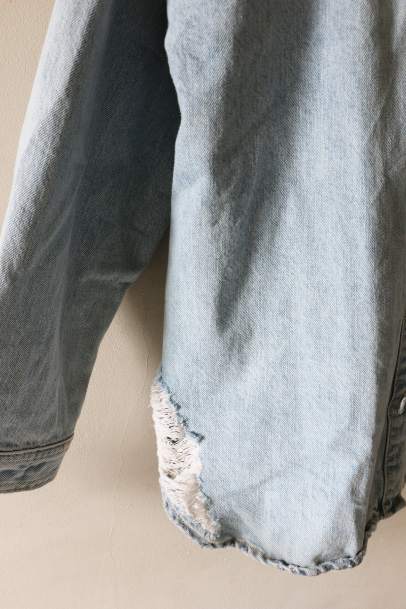 ZARAのデニムコレクションで定番となっている、ダメージ加工を施したオーバーシャツ。身幅をたっぷりと取ったオーバーサイズのシルエットに、随所に配されたリップド加工がラフなニュアンスを添えています。コットン100%のタフな質感ながら、ライトブルーの淡い色合いが春夏の空気感に馴染む一枚です。