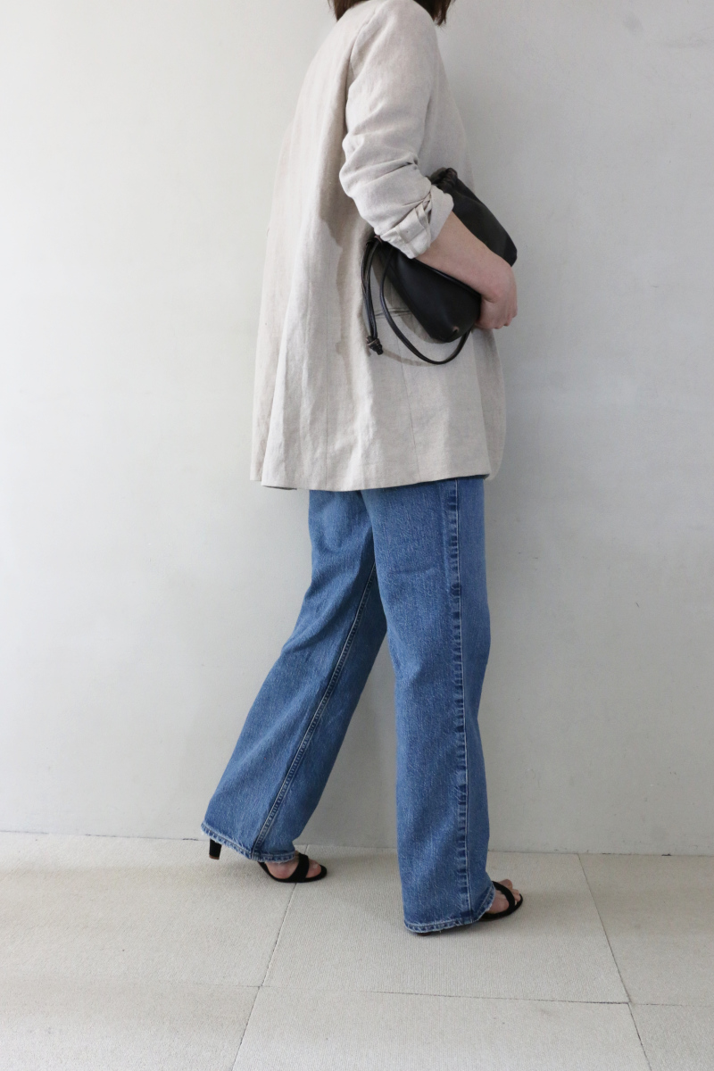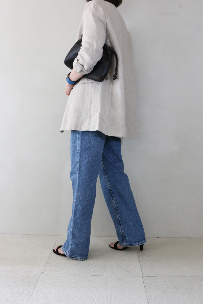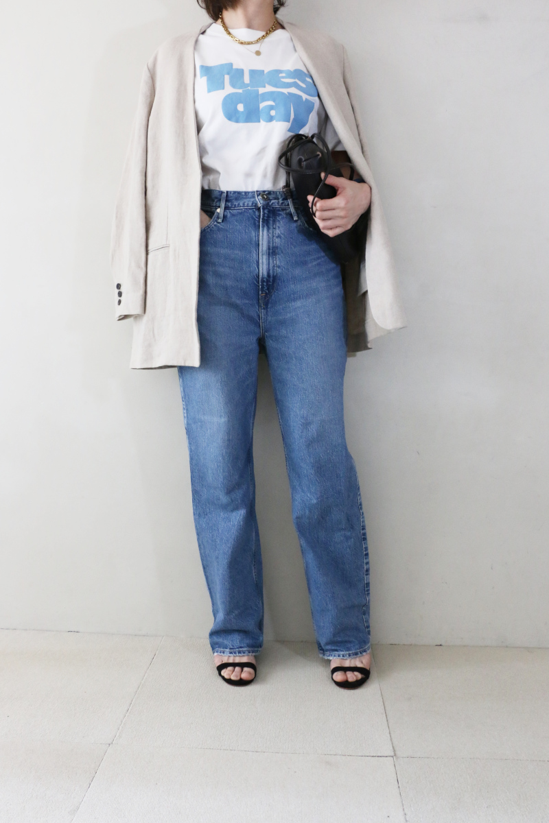 リネンジャケットのナチュラルな風合いと、遊び心のあるロゴTシャツの組み合わせが、程よい抜け感を生んでいます。袖を捲って手元のジュエリーを覗かせたり、センタープレスパンツを合わせたりすることで、より落ち着いた印象もお勧めできる着こなしです。