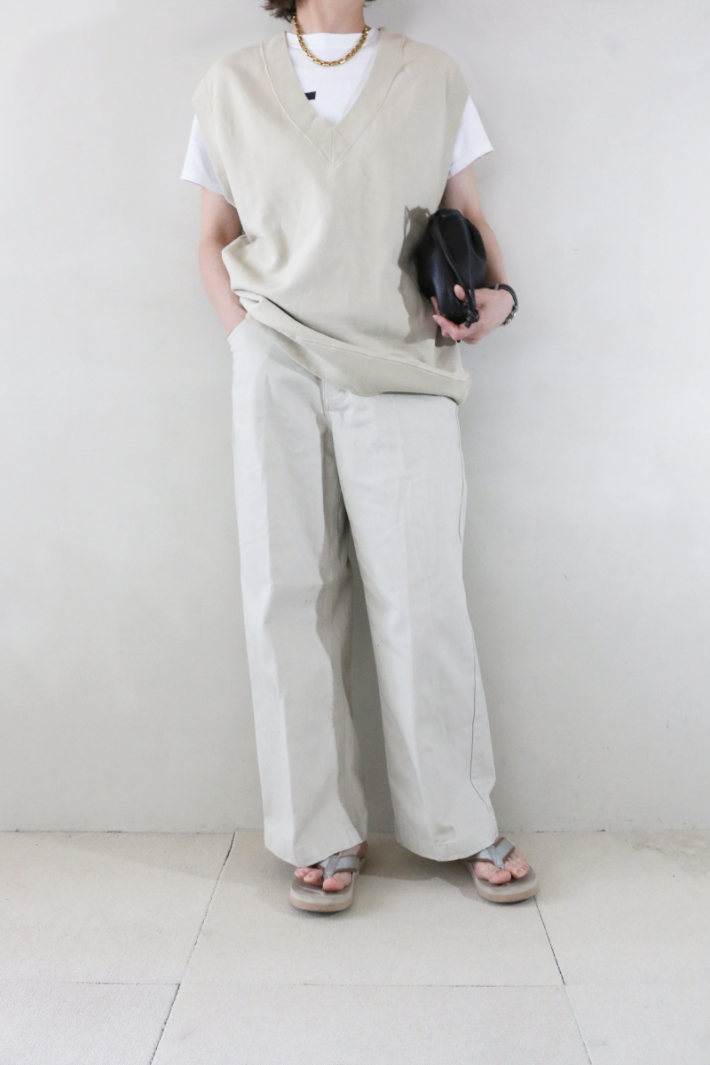 程よい抜けをつくるPlageのVネックオーバーサイズベスト。インナーにカットソーやシャツを重ねてももたつきにくく、レイヤードの幅が広げてくれます。ラフなシルエットながら深めのVラインが全体をすっきりと見せ、軽やかな印象。