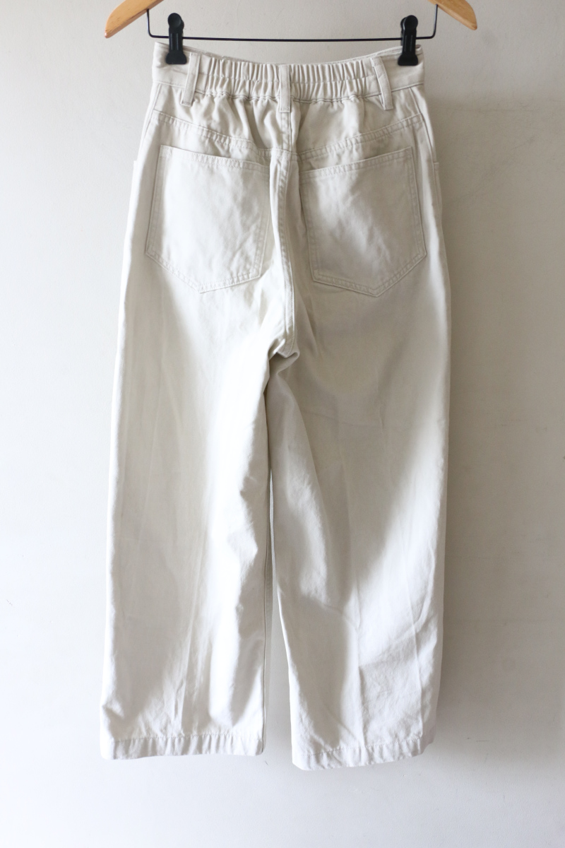 バックギャザー入りの同系色のチノパンツで柔らかな白を重ねやさしい印象をプラス。後ろ姿にさりげない動きが出るデザインで、シンプルな中にも表情があります。ゆるく合わせることで力の抜けた雰囲気が生まれ、日常使いからちょっとした外出まで自然に馴染む組み合わせです。