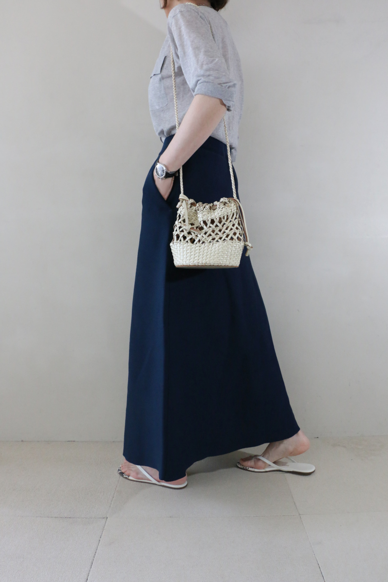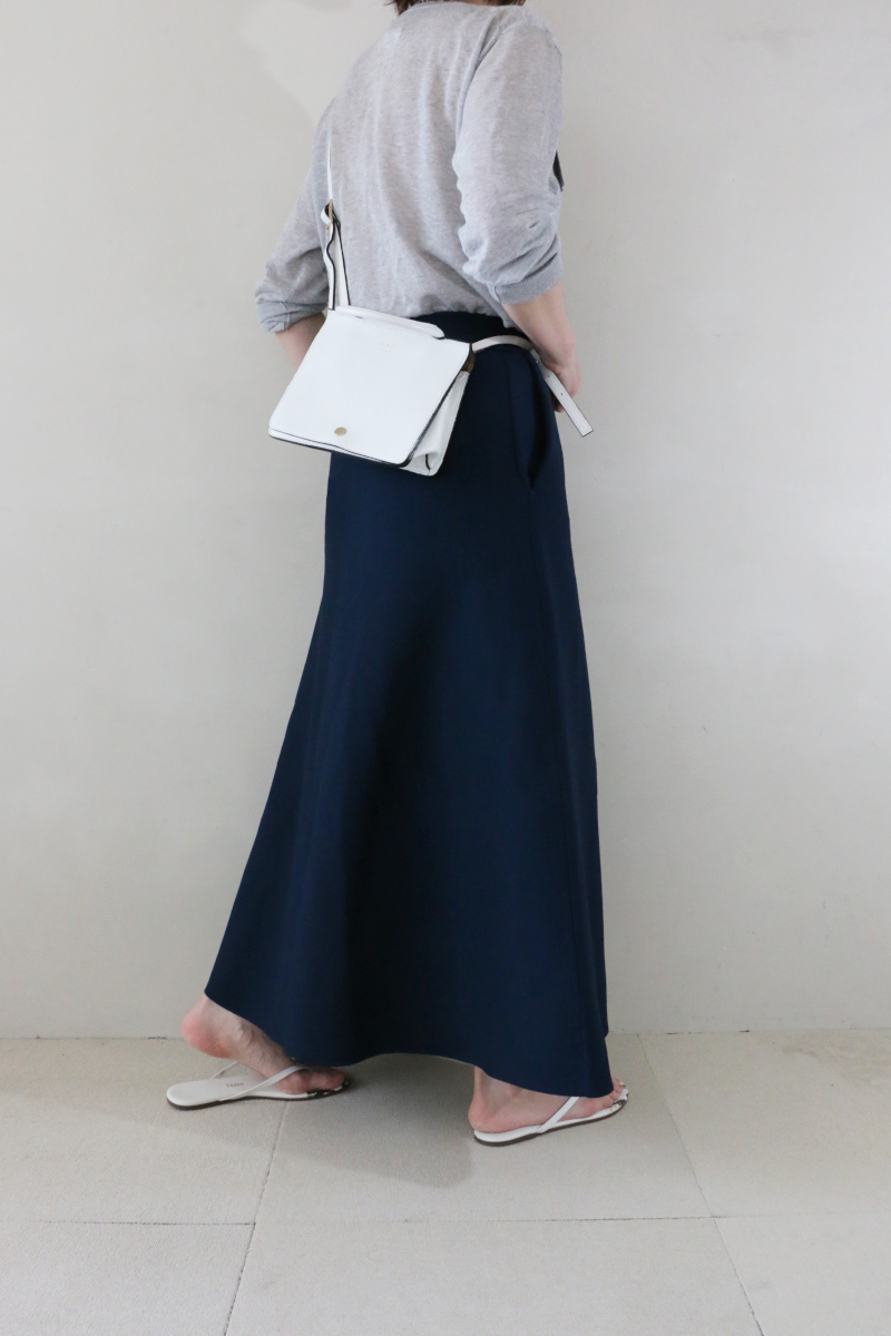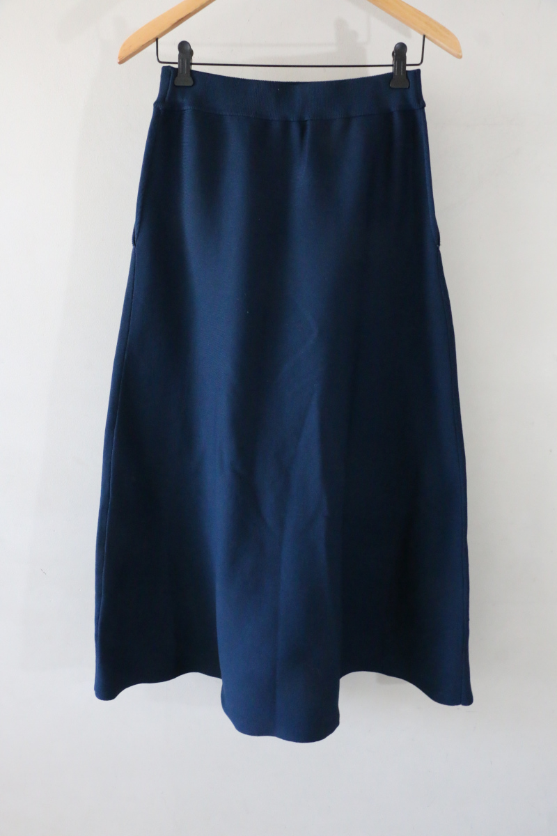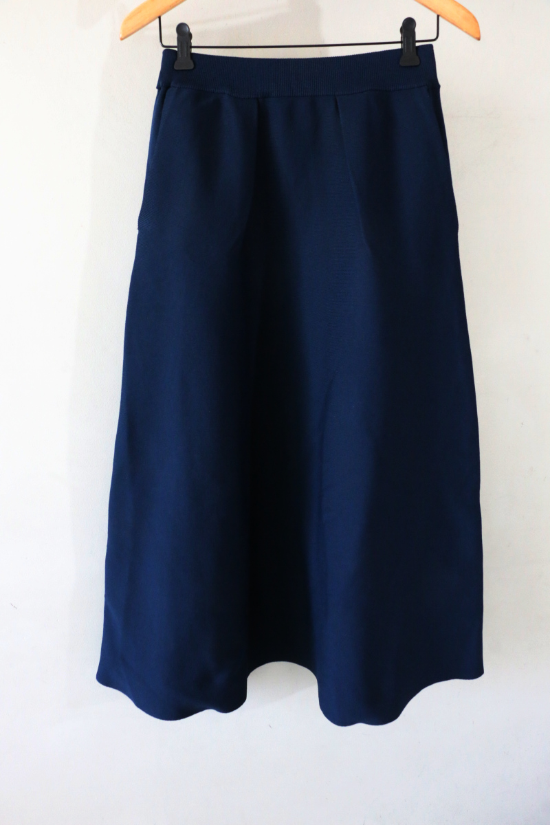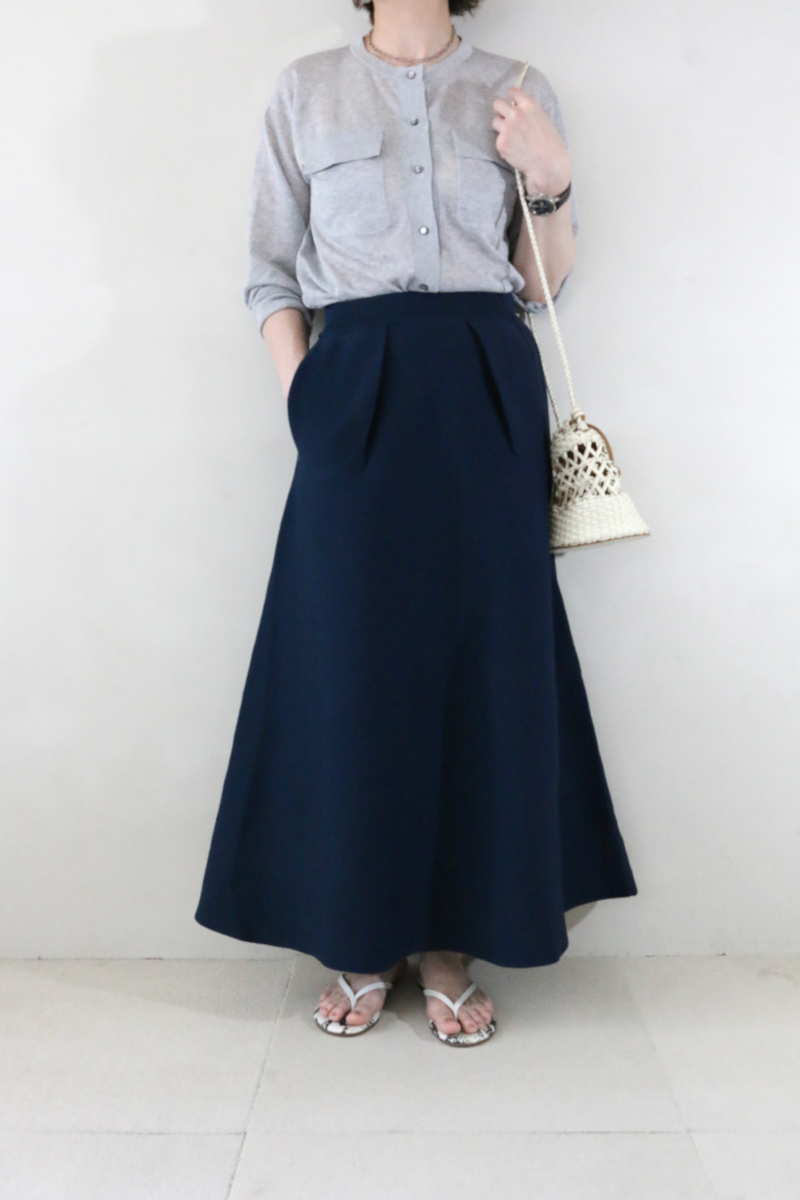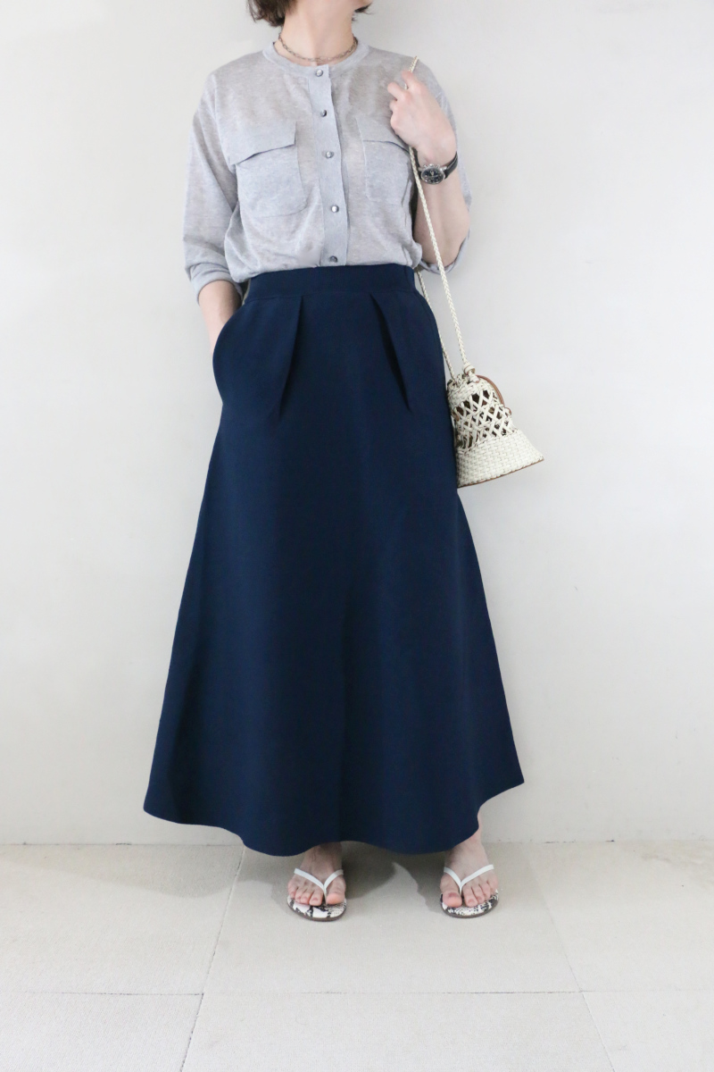ネイビーのニットスカートはフロントに入ったタックが程よい立体感を生み、シンプルな中にひとさじのデザイン性を添えてくれます。トップスを軽くINすることでそのディテールが引き立ち、装いにさりげない表情が生まれる着こなしがおすすめです。