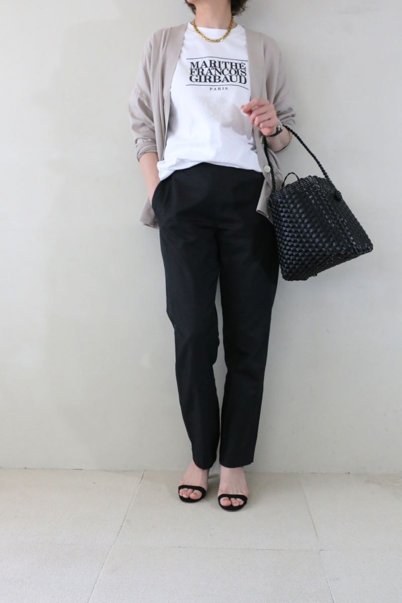 白のロゴT+黒のボトムを使い、シンプルながらメリハリを作ったモノトーンコーデ。程よく存在感のあるロゴがアクセント。ラフすぎず日常に取り入れやすいバランス。軽やかな素材感で、季節の変わり目にも取り入れやすい組み合わせです。