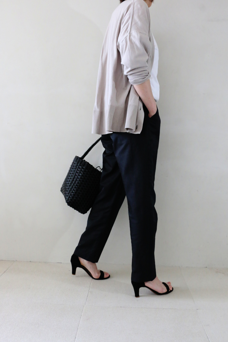 ベージュのドライコットンカーディガンを羽織ることで、モノトーンにやわらかなニュアンスをプラス。軽い着心地で気温調整にも役立ち、室内外の行き来にも自然に対応できる、実用性のある一枚です。