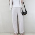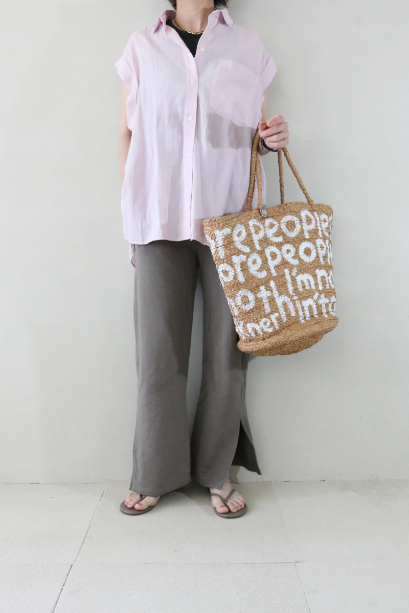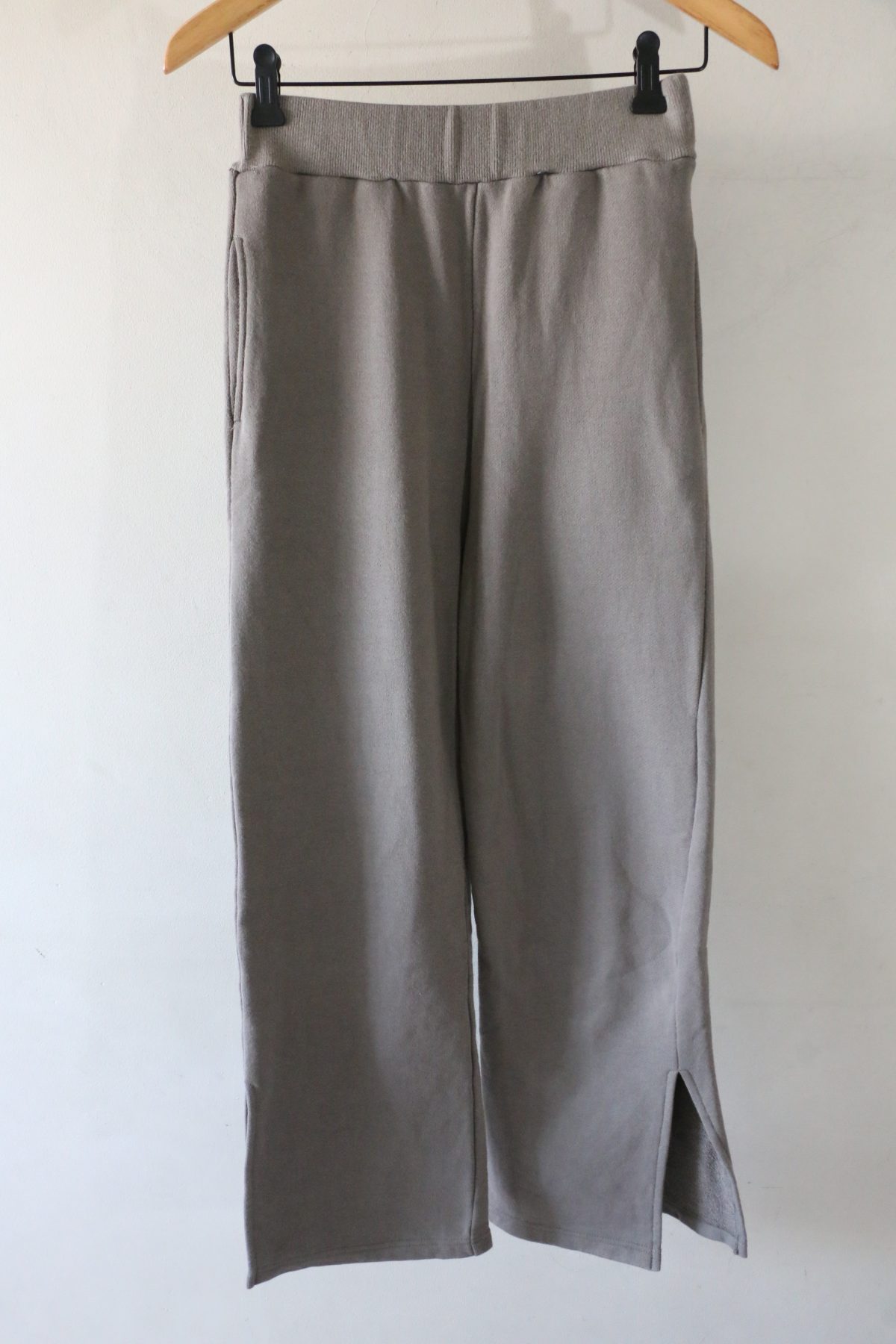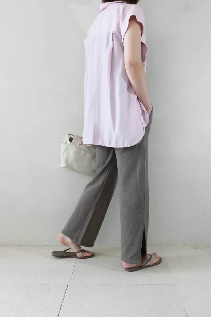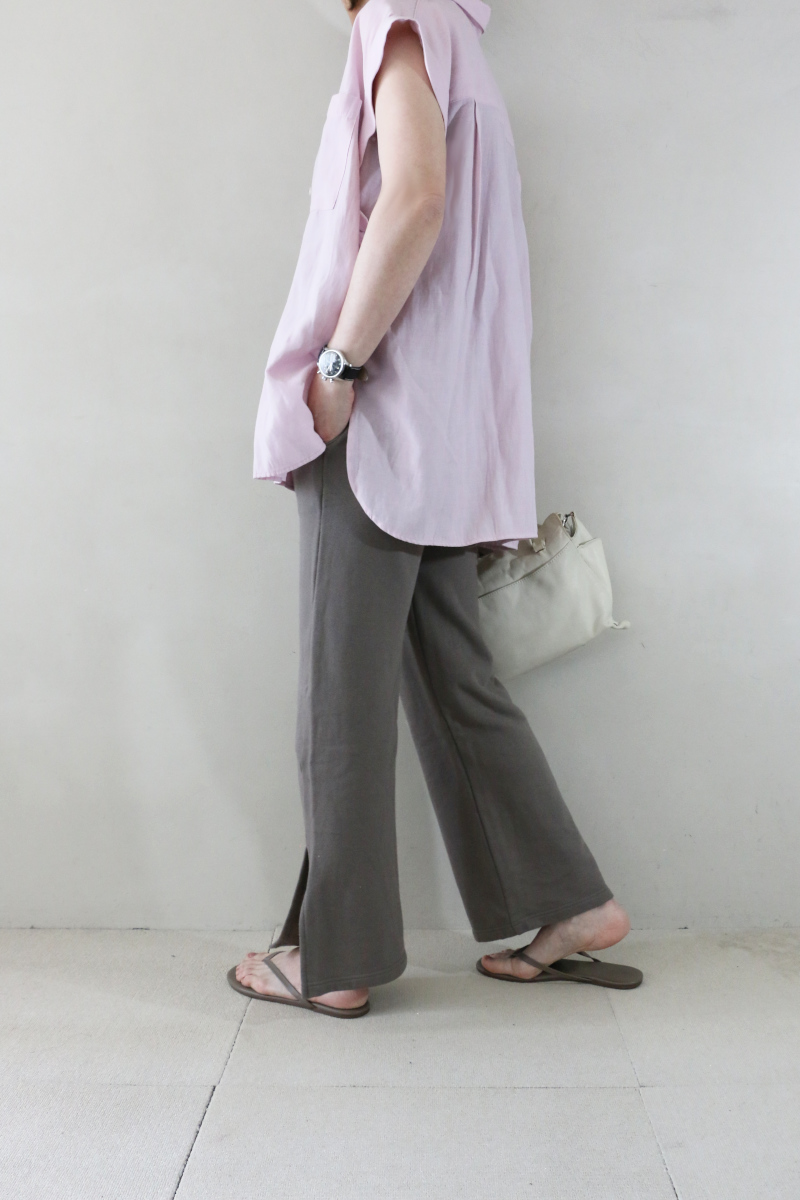 モカ系のスウェットパンツは、リラックス感がありながらもサイドスリットがさりげないアクセントに。足元に抜けが出ることでトップスとのバランスがとりやすく、スニーカーからサンダルまで幅広く合わせやすい印象です。淡いピンクとの組み合わせで、穏やかなトーンの大人カジュアルが楽しめるコーディネートです。