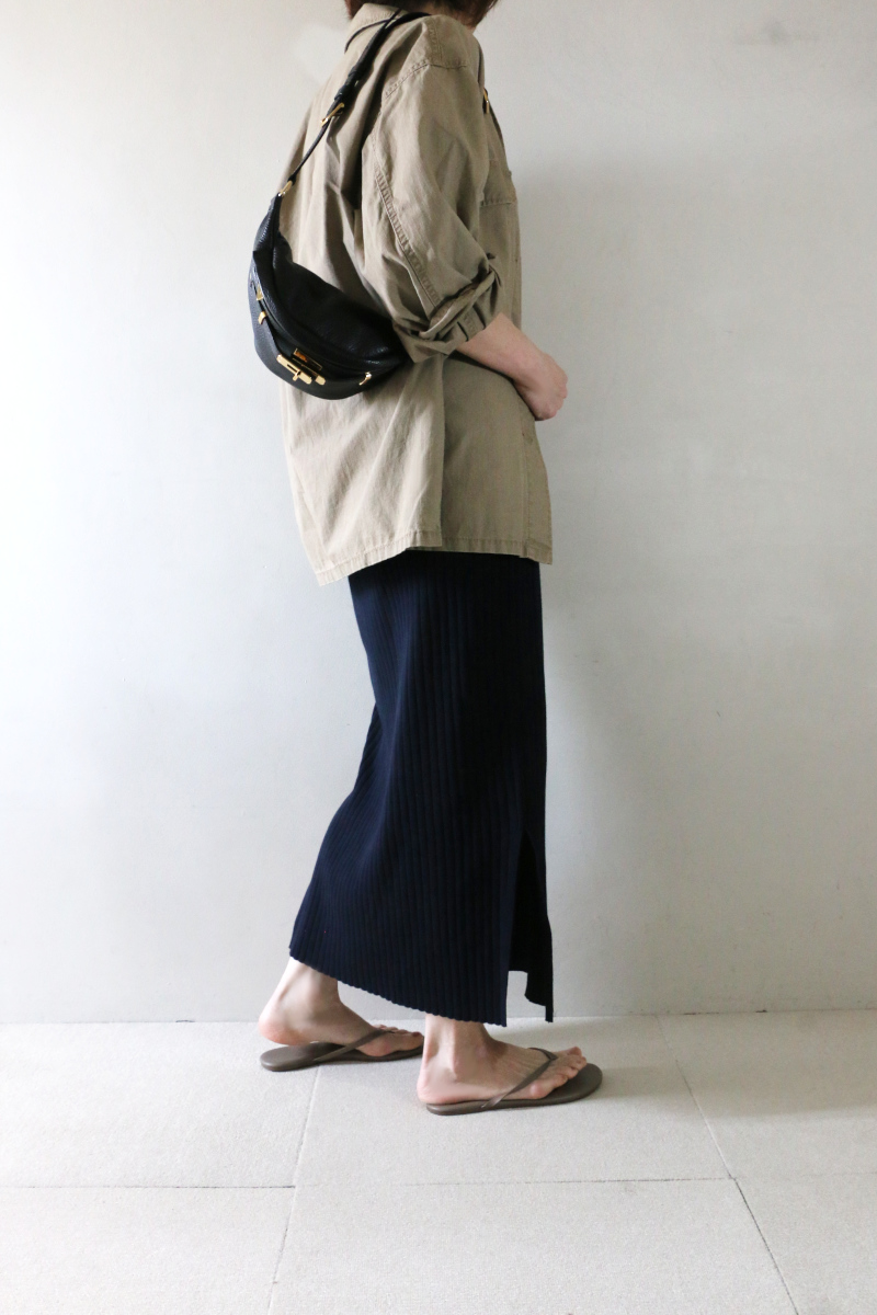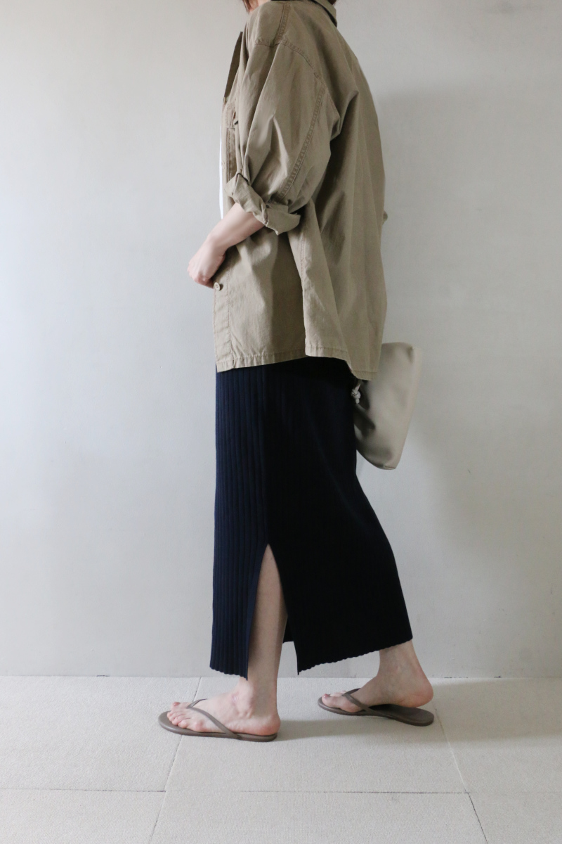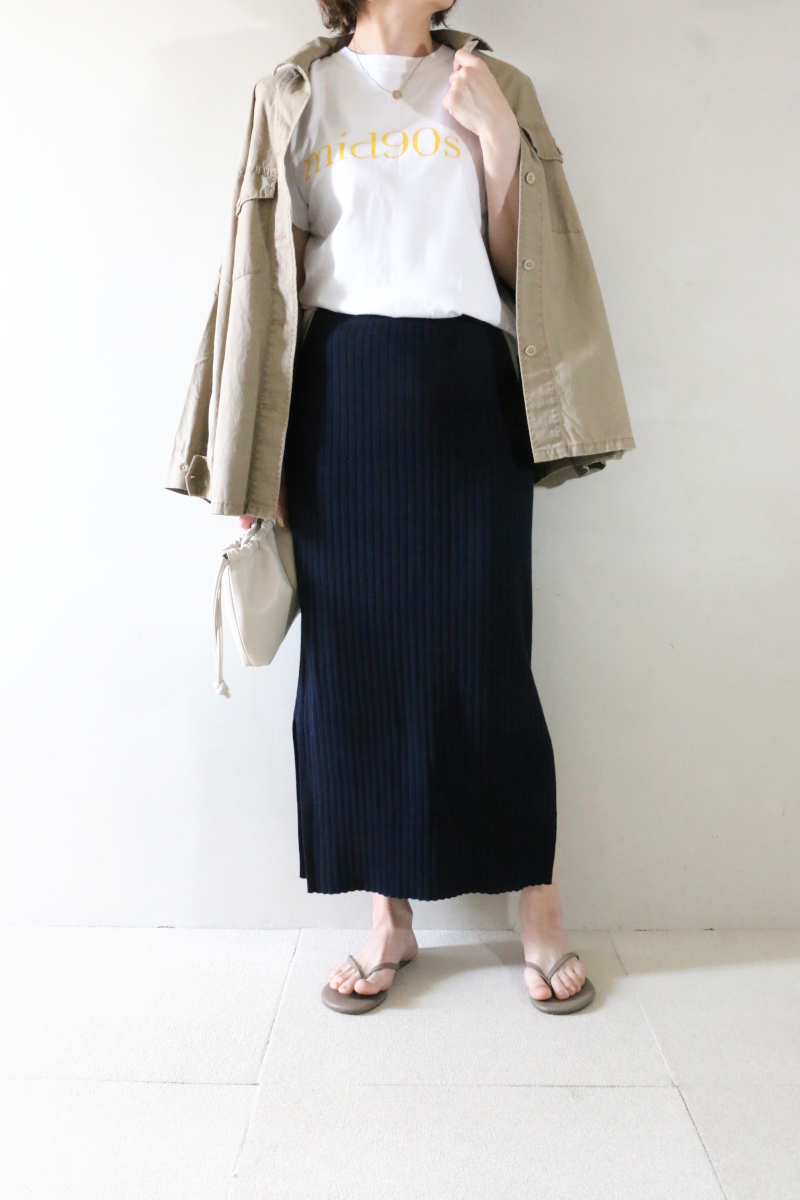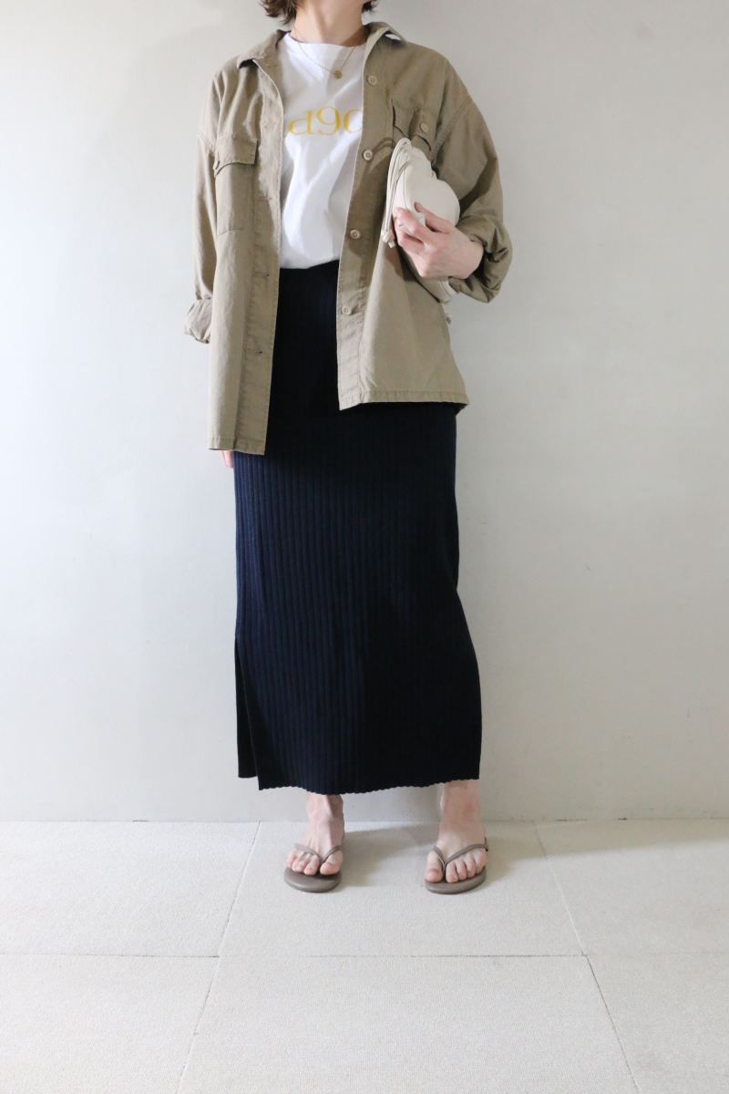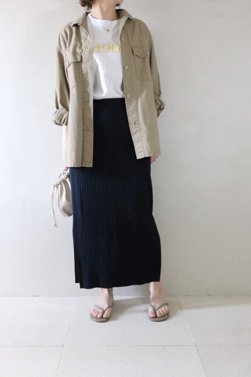 ネイビーのリブニットスカートは、すっきりとしたタイトシルエットで全体を引き締める役割に。縦のラインが強調されるため、ボリュームのあるトップスともバランスが取りやすく、落ち着いた印象へと整えます。足元はフラットでも軽やかにまとまり、日常の延長で取り入れやすいアイテムです。