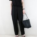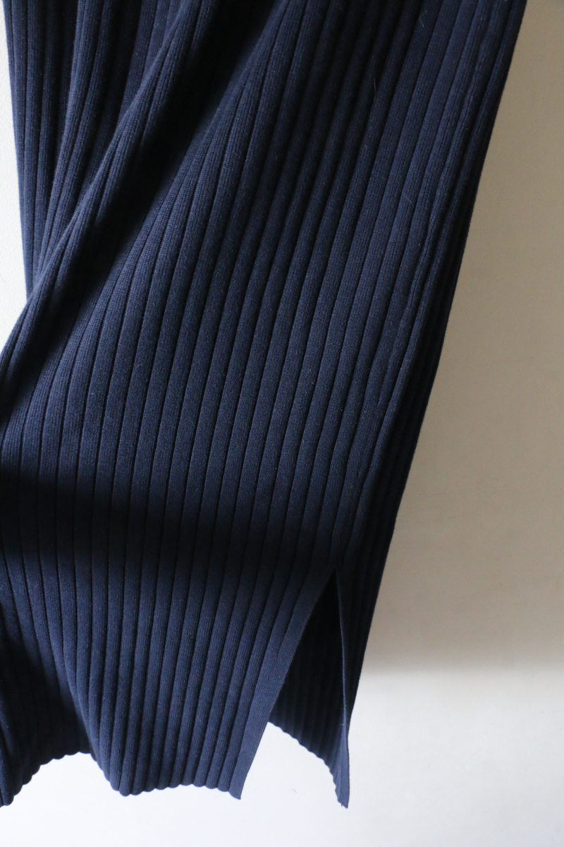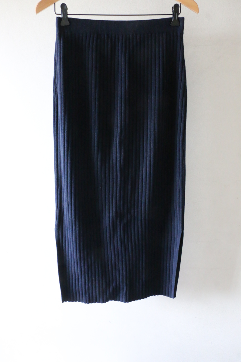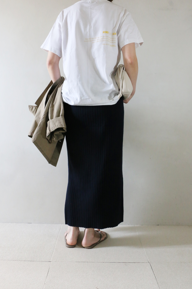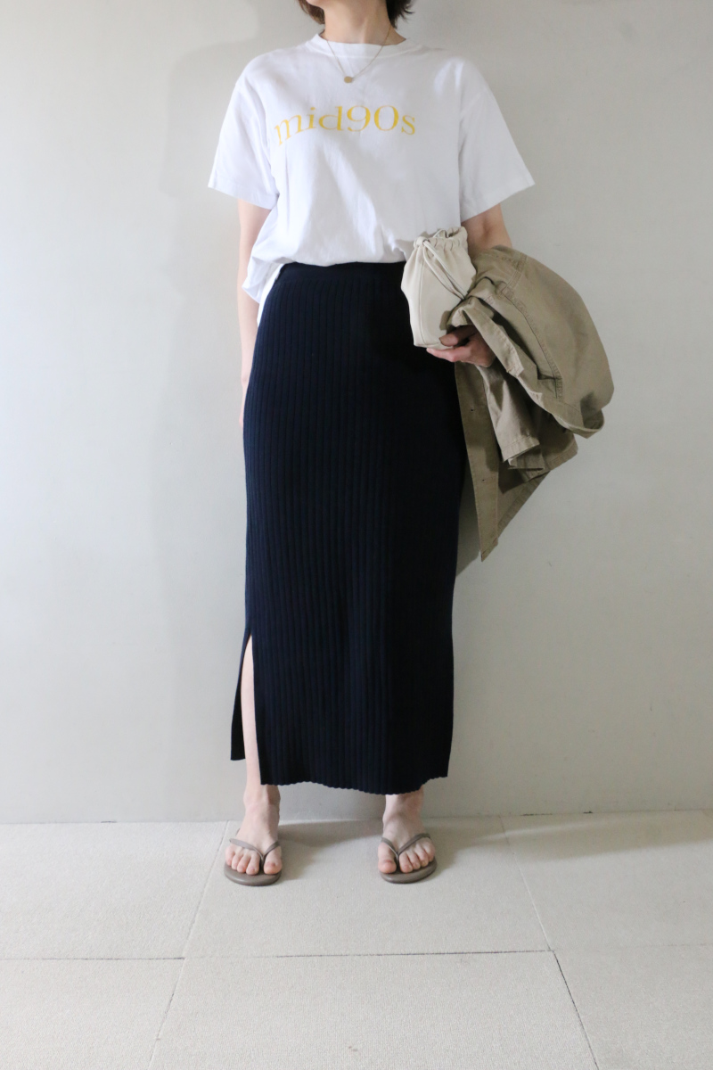 ネイビーのリブニットスカートは、すっきりとしたタイトシルエットで全体を引き締める役割に。縦のラインが強調されるため、ボリュームのあるトップスともバランスが取りやすく、落ち着いた印象へと整えます。足元はフラットでも軽やかにまとまり、日常の延長で取り入れやすいアイテムです。
