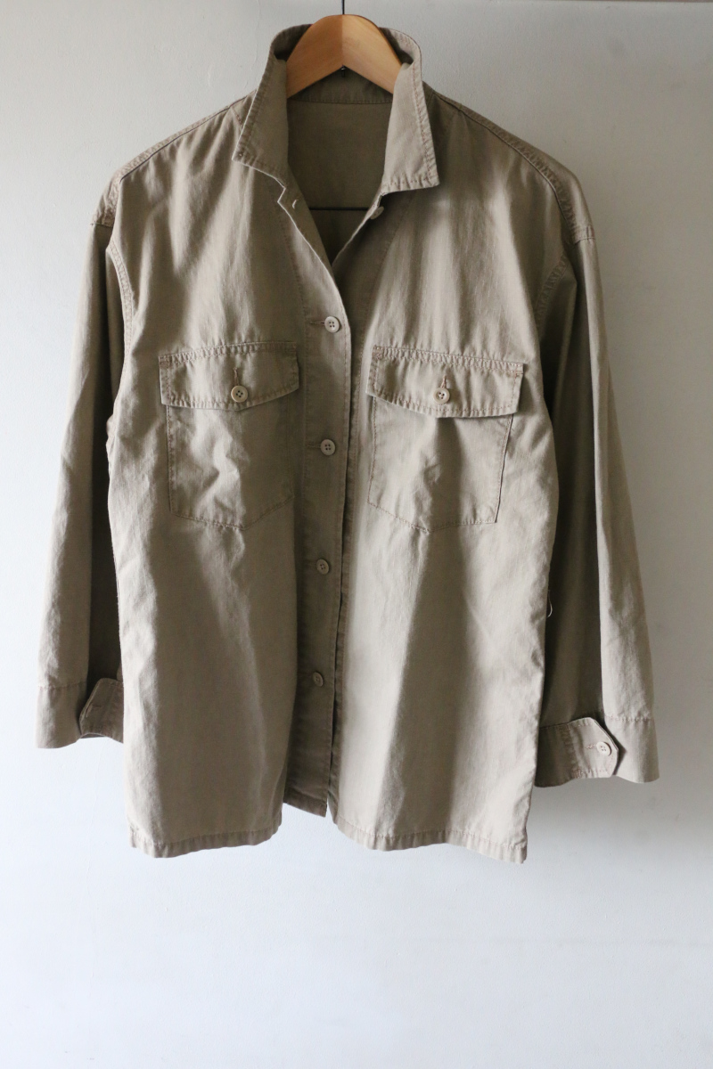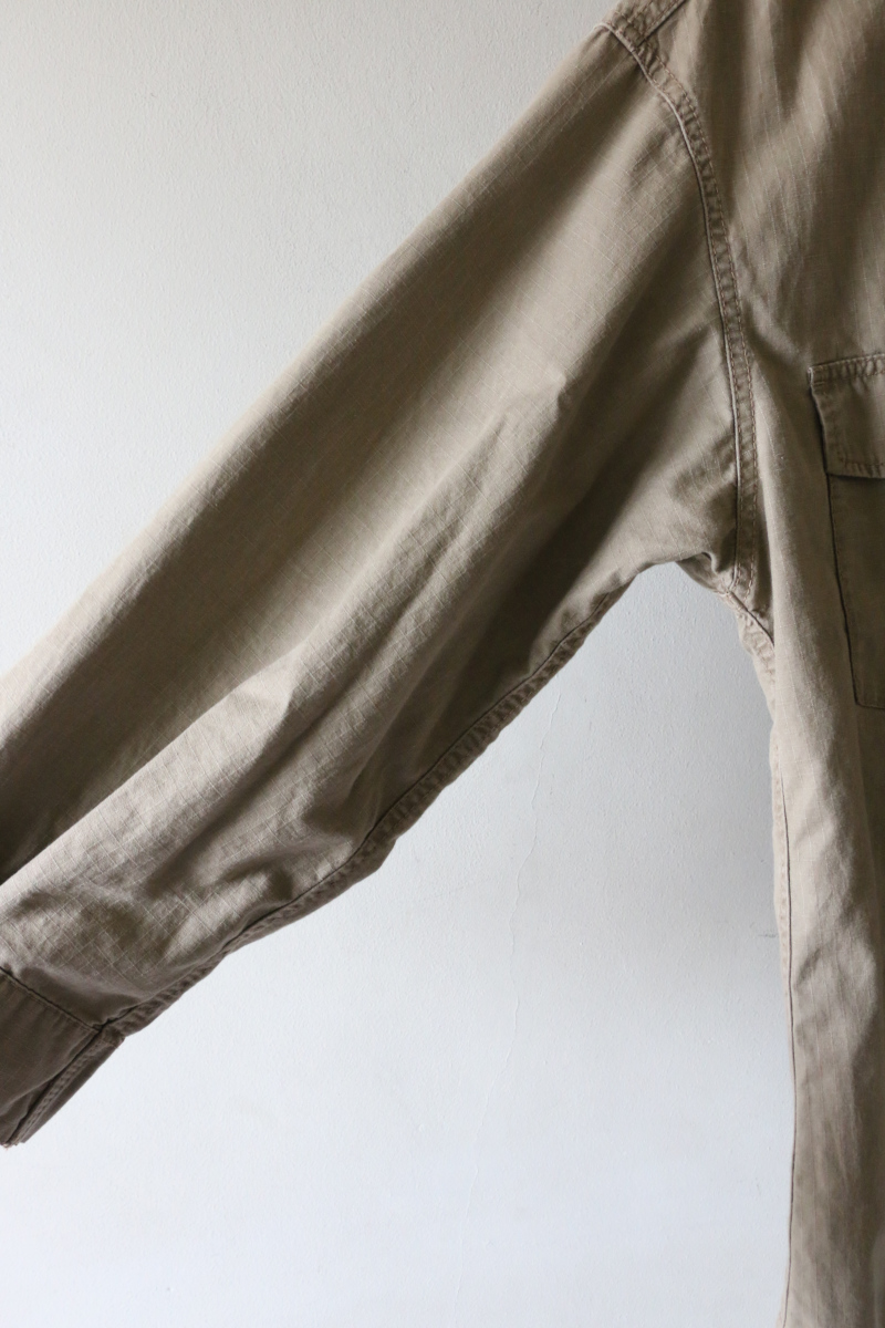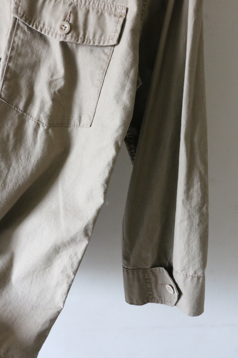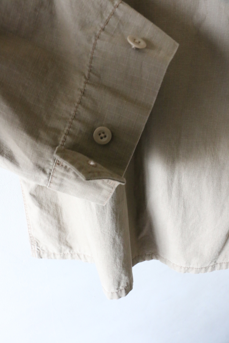 リップストップのアーミーシャツを主役にスタイリング。シャツ以上ジャケット未満の絶妙な立ち位置が魅力。程よいハリのある素材感で軽く羽織るだけでも形が決まり、季節の端境期にも頼れる一枚です。お袖にゆとりがあり、丸みのあるシルエットがさりげなく印象に残るポイントに。長袖のカットソーを重ねても収まりがよく、インナーのデザインやボリュームを選びにくいところも着こなしの幅を広げてくれます。ロゴTの明るい色味が控えめなアクセントになり、重ね着の奥行きも楽しめます。