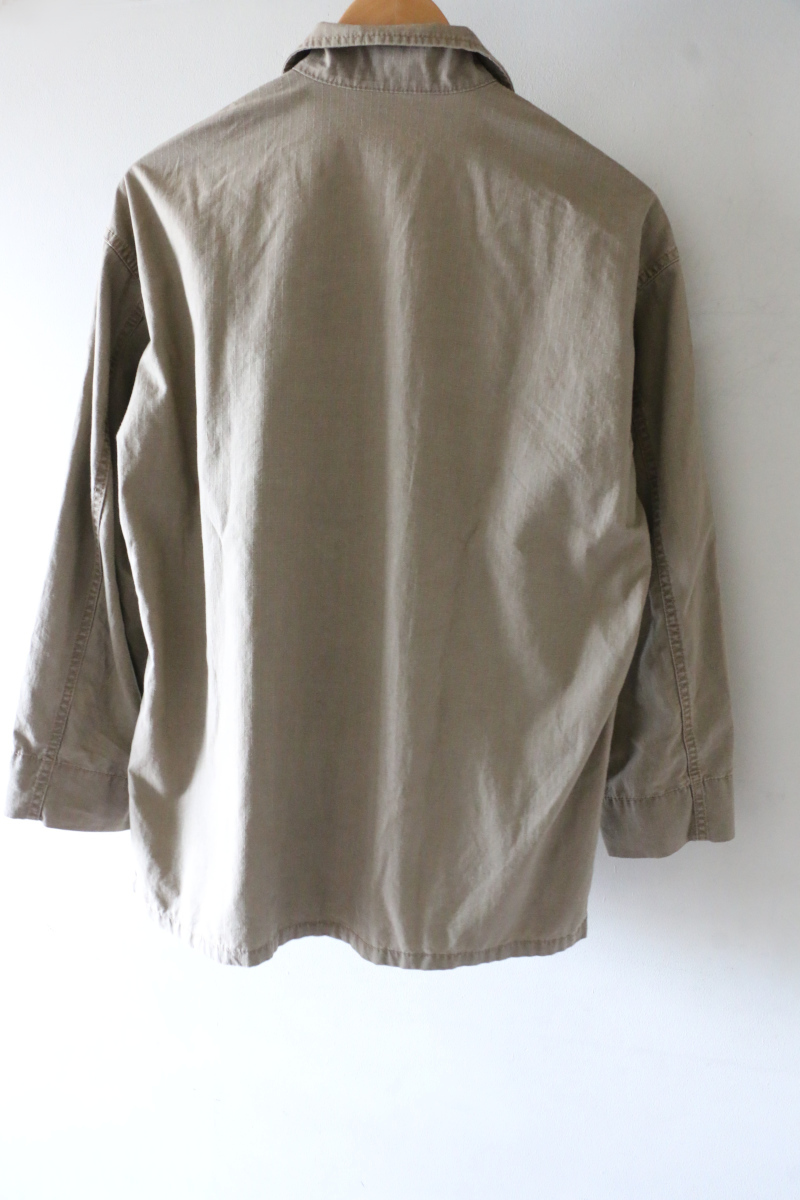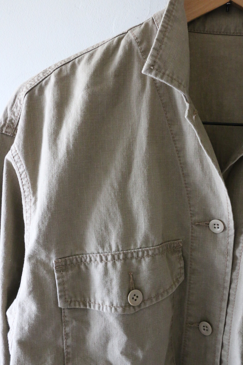 【2023A/W】Spick & Spanインナーを選ばないシャツ感覚で着れる人気のワークブルゾン。製品加工を施し、独特なユーズドライクな味わい深い表情がポイント。アウトドアグッズやスポーツ用品にも使われる軽くて丈夫なリップストップ生地を採用し、しっかりとしたハリ感とややワッシャーがかったような素材感が特徴です。オーバーサイズのシャツジャケットデザインで、フラップポケットなどミリタリーディテールにこだわりました。袖口はやや太めで、アジャストボタンで細くしたり、ロールアップしたりと好みのバランスで着れるのもポイント。肌寒いときにさらりと気軽に羽織るアウターとして便利なアイテム。トレンド問わず永くご愛用いただけるデザインは、ワードローブの定番として是非おすすめしたい一着です。