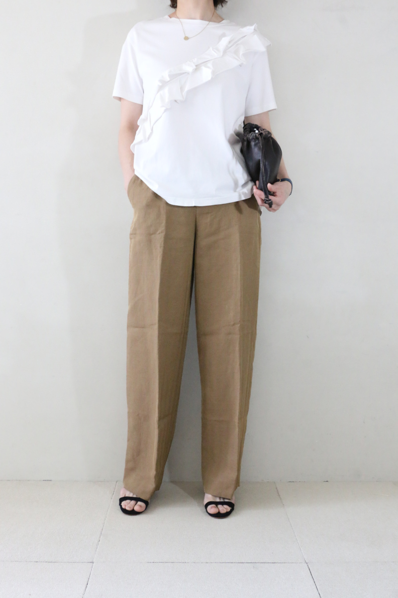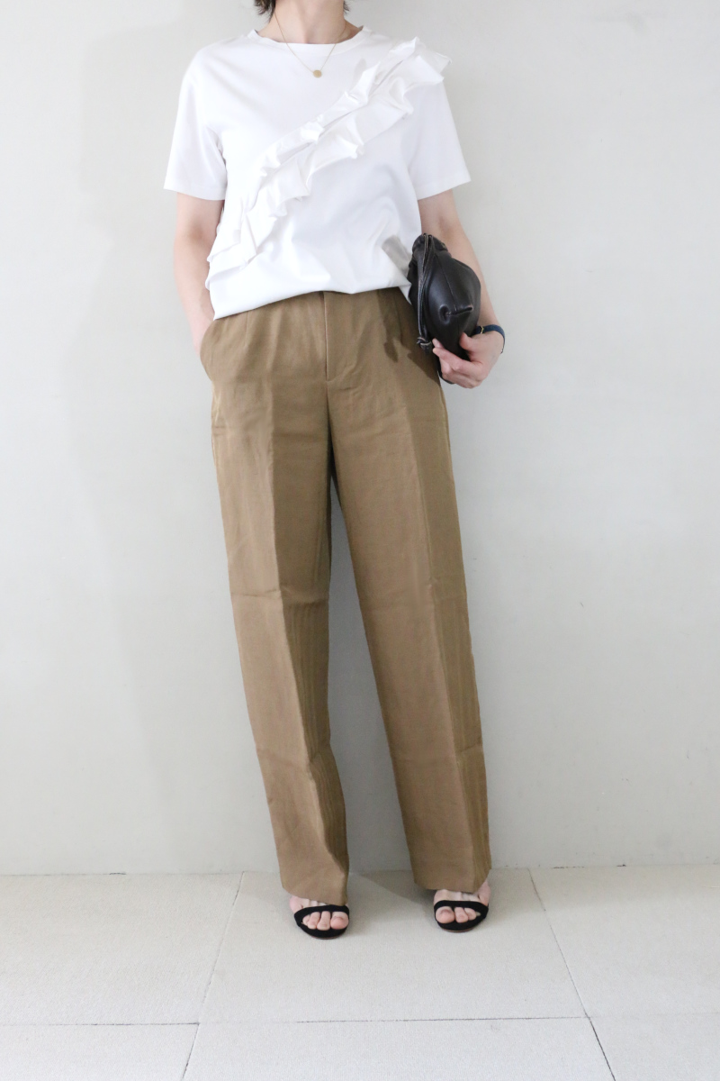 軽やかな白のフリルと、落ち着きのあるキャメルブラウンのパンツ。相反する要素を持つ二つを重ねることで、適度な大人のリラックススタイルが完成します。今回は足元には華奢なサンダルを、手元にはレザーの小物を添えて。質感の重なりを楽しむ大人のしなやかな装いです。