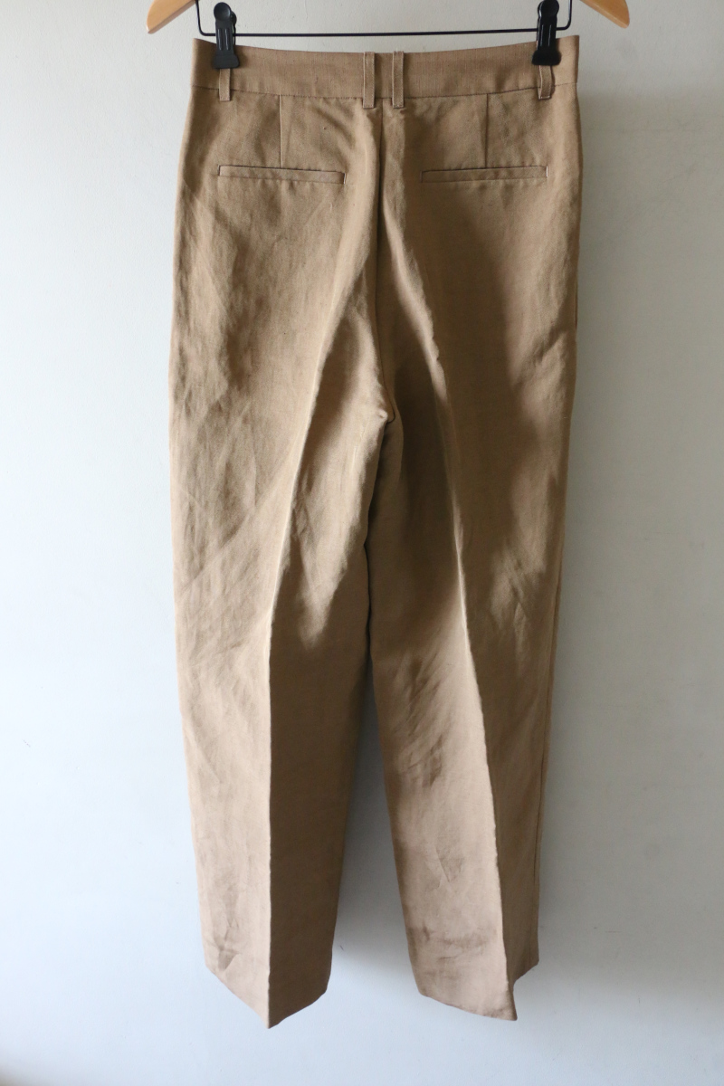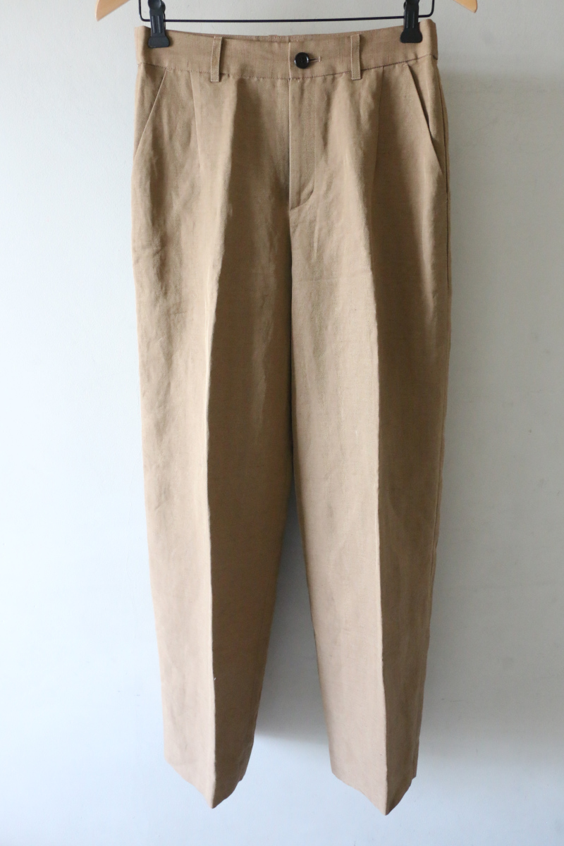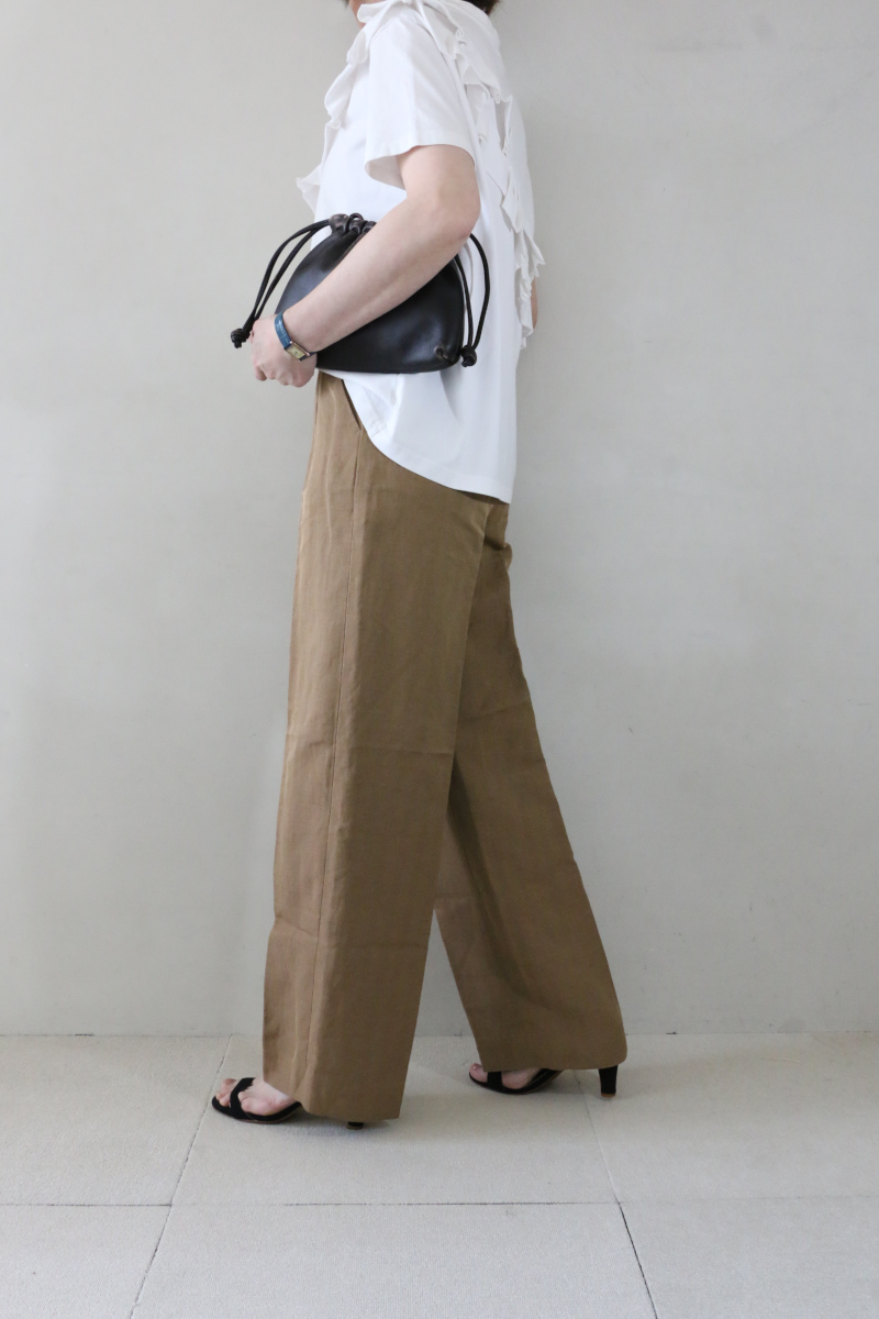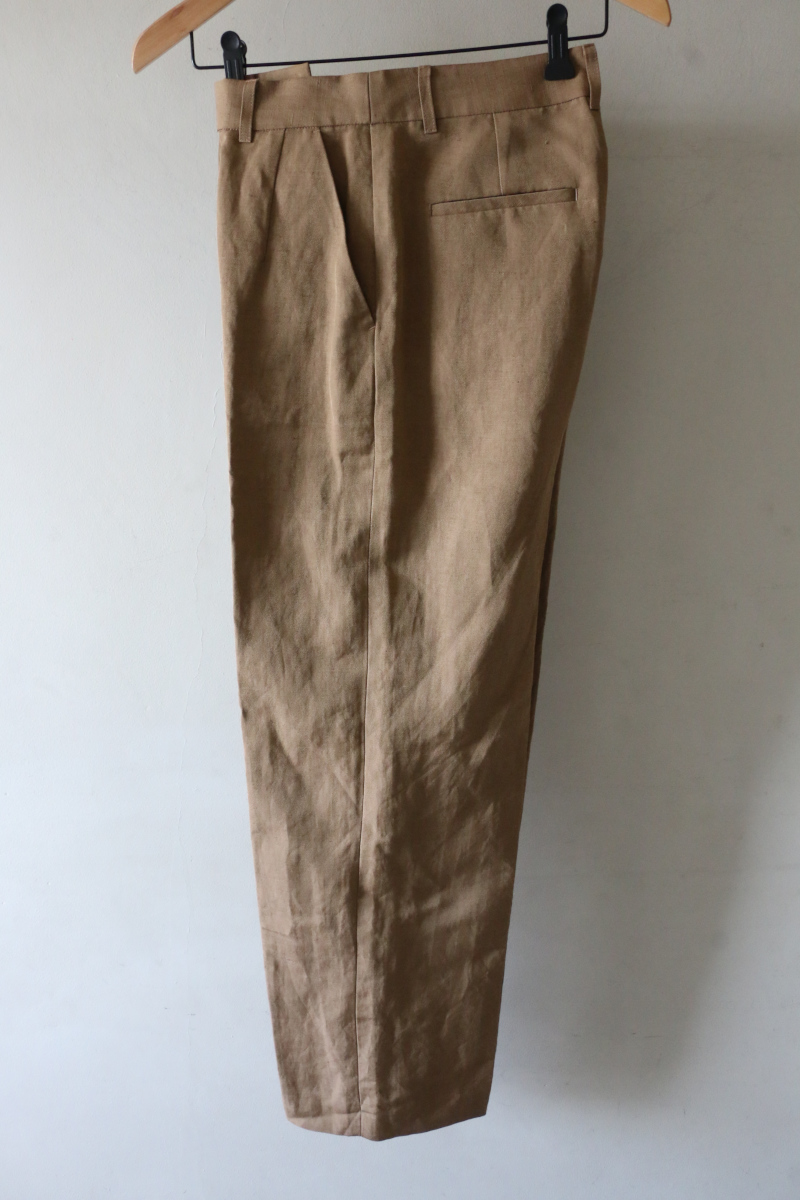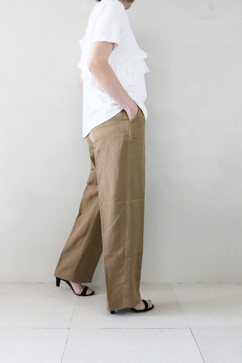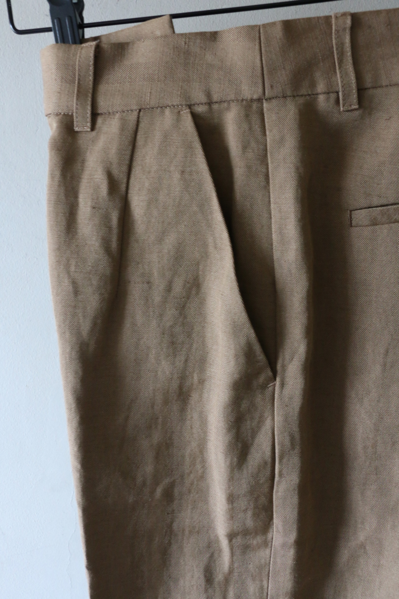 リラックスしたムードも併せ持つセミワイドパンツ。生地の程よい落ち感とドライなタッチが相まって、ヒップから裾にかけての美しいシルエットが魅力。濃淡2色の糸使いでワントーンでも奥行きのある色と、へリンボンのピッチにもこだわった一枚。麻の自然な風合いとヴィスコースを合わせた独特の乾いた質感はインポート素材ならでは。ラフなスタイリングでも良質感が漂うパンツです。※ポケット数:横×2 後ろ×2