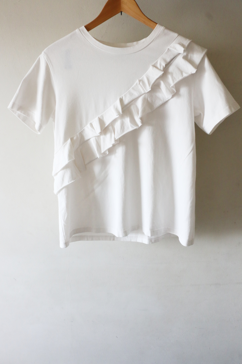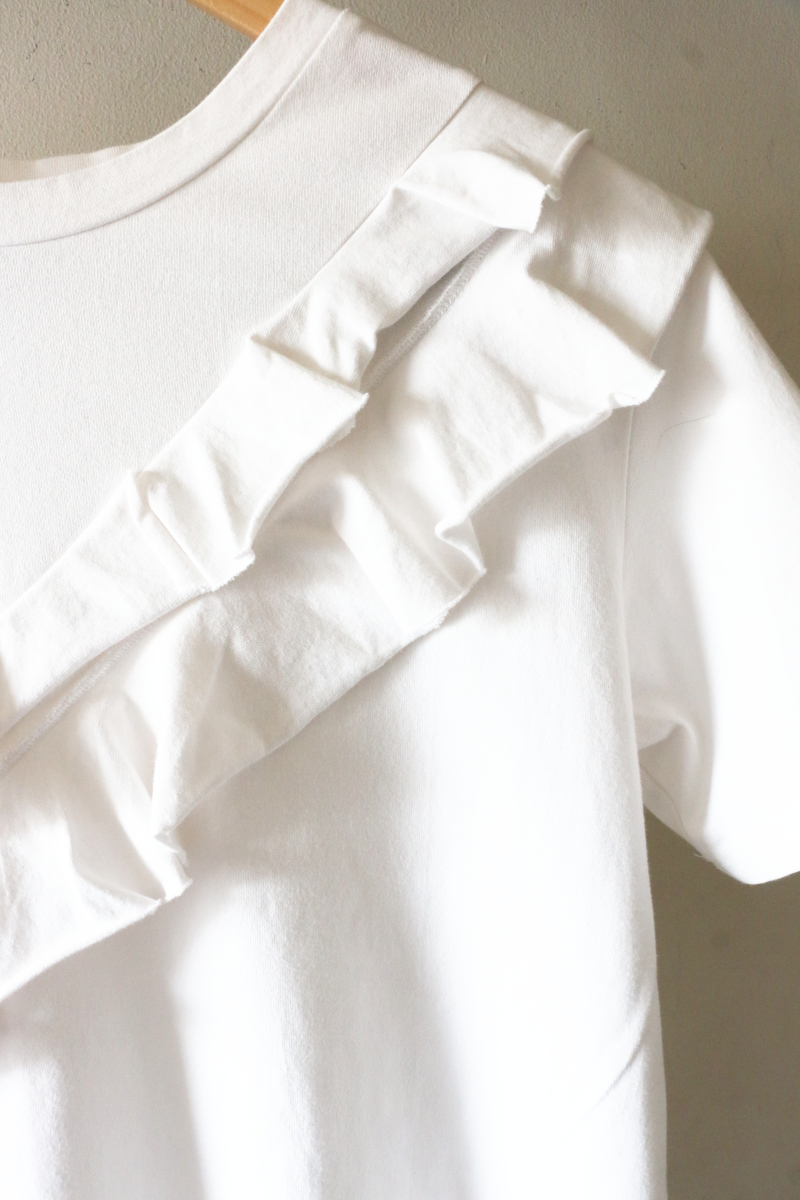 アシンメトリーなフリルが目を引くTシャツは、日常の装いに静かな華やぎを添えてくれる一枚。甘い印象のフリルですが、ドライな質感のコットン素材がベースとなることで、大人の女性に似合う落ち着いた印象を作ります。ご自宅でのケアがしやすいため、これからの季節に気兼ねなく手に取れます。