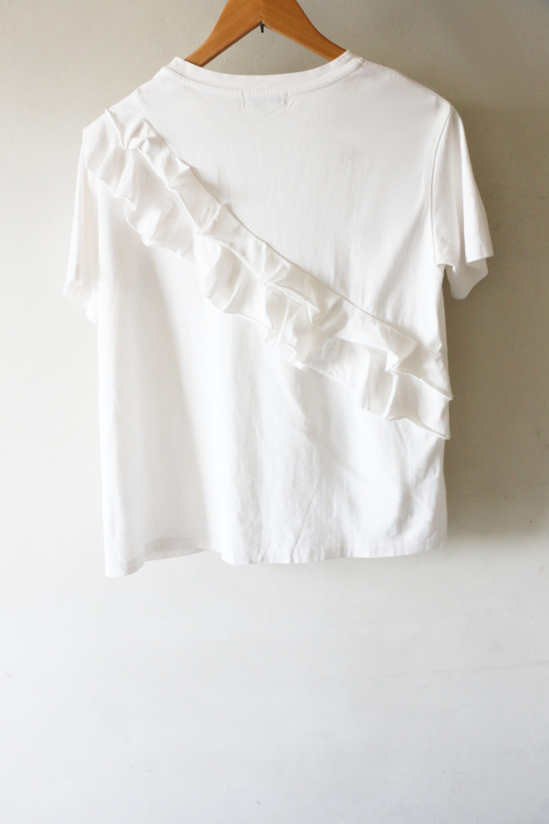 アシンメトリーなフリルディテールがポイントの大人可愛いTシャツ。カジュアルなアイテムと相性が抜群で、いつものコーディネートに取り入れるだけでこなれたスタイリングに。綿素材なのでご自宅でケアしやすいのも嬉しいポイント◎シンプルなコーディネートが増えてくるこれからの時期に活躍すること間違いなしのアイテムです。※取り扱いについては、商品についている品質表示でご確認ください。