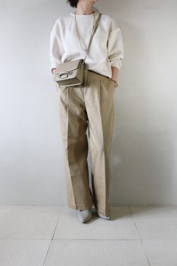 ふわりとした立体感と軽やかな着心地で人気を集め、リピート生産が続くR’IAM PLAGEのMA-1ブルゾン。初回から注目を浴びたベージュカラー。ロゴインターシャのモカニットと深みのあるブラウンのワイドパンツを重ね、ブラウン系でまとめたワント