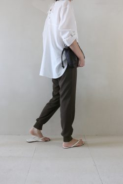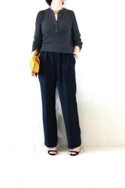 カジュアルなヘンリーネックですが、Deuxiemeらしく女性らしいシルエットに作り込んであり、程よい抜け感を演出してくれます。素材は伸縮性抜群。手に取っただけでも「こんなに伸びるの?」と驚かされるほどで、動きやすく着心地の良さを実現していま