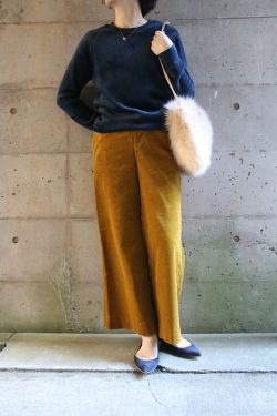 下半身をカバーしながらもスタイルアップが叶うワイドパンツコーデ。ゆったりしたボトムにトレーナー感覚で着れるベロアタッチのトップスを投入。フリースに近い素材でストレッチがきいており動きにくさを感じない心地よい着心地です。マカフィーのコーデュロ