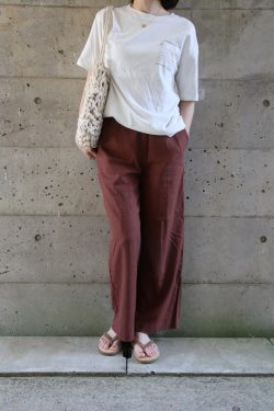 ベージュのバックロゴがおしゃれなこなれTシャツ。ブラウンのワイドパンツでハンサムな着こなしに。初夏から真夏にも軽やかなTシャツコーデは頼れるアイテムですが決まって似たようなコーデになりがちです。色合わせや素材にこだわりお友達とちょっと差を付