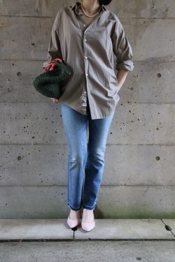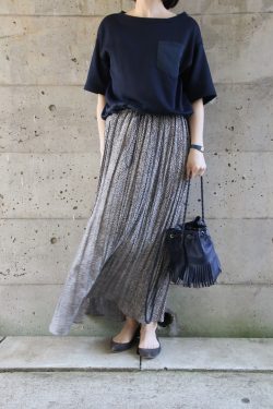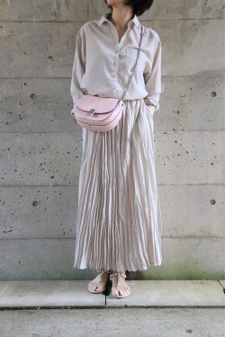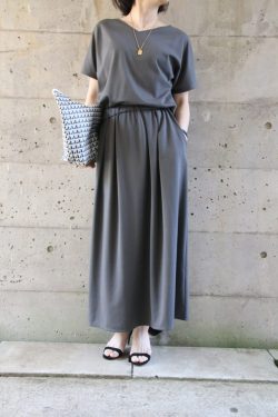 一見セパレートのように見える涼しげなブラウスワンピースをご紹介します。ライトベージュで女性らしいきれいめイメージがありながら、ブラウスの裾後ろが長めでラフさがある特徴のあるデザインです。ドライタッチで通気性もよくこれからのシーズンにピッタリ