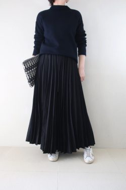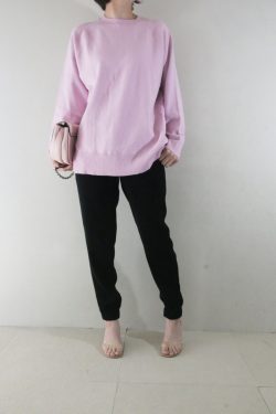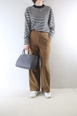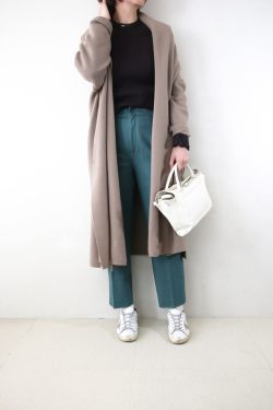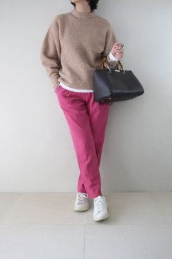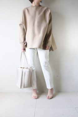洒落感たっぷりベージュ×ホワイトコーディネートをメイク。ぼんやりしないよう、クリアな白パンツをボトムに使い軽やかさをプラス。パリっとした体が泳ぐ空気感たっぷりのオーバーニットは上品なのにどことなくカジュアルテイストで力を抜いた自然なコーディ