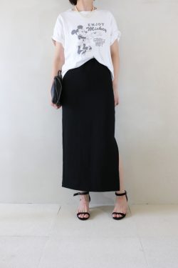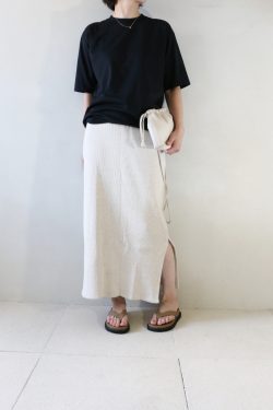 コンパクトな白黒ボーダートップスに、リッチなボリューム感が魅力のタックスカートを合わせた上品カジュアルスタイル。トップスは裏側がループ起毛で、着心地もふんわり柔らか。袖を軽くまくると内側のピンクがのぞき、さりげない可愛さを演出してくれます。
