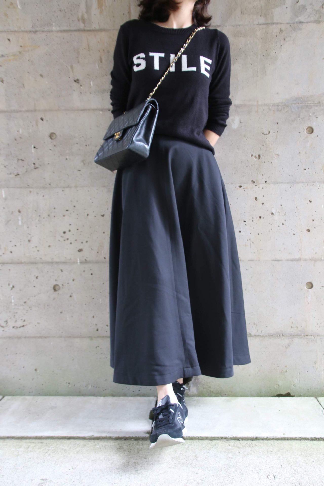 レザーを使った格上大人コーデです。金ボタンが今年らしいレザースカートはフレアシルエットでハード過ぎないかわいらしさがあります。やわらかいふわっとしたニットに合わせてモノトーンでコーデ。トップスを選ばないでとても合わせやすいスカートです。フェ